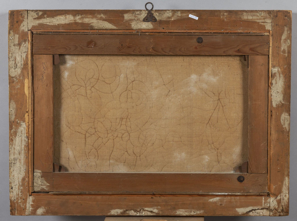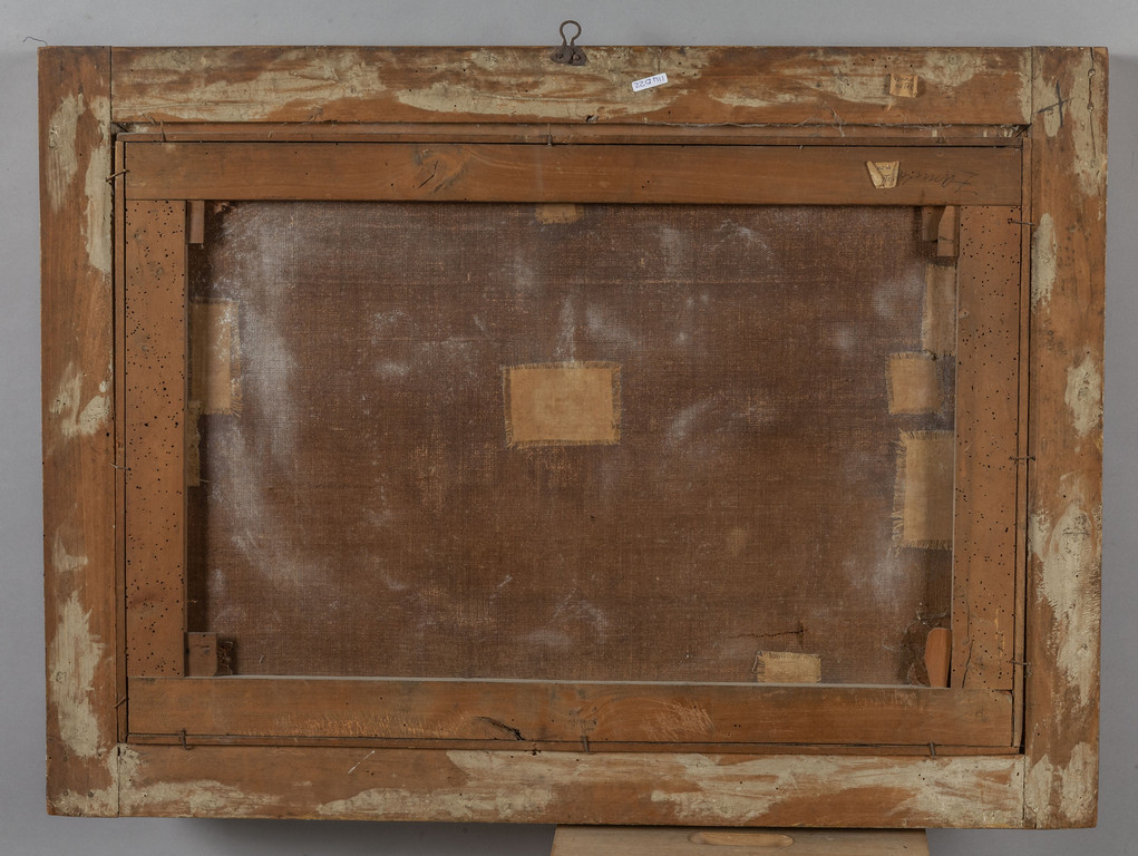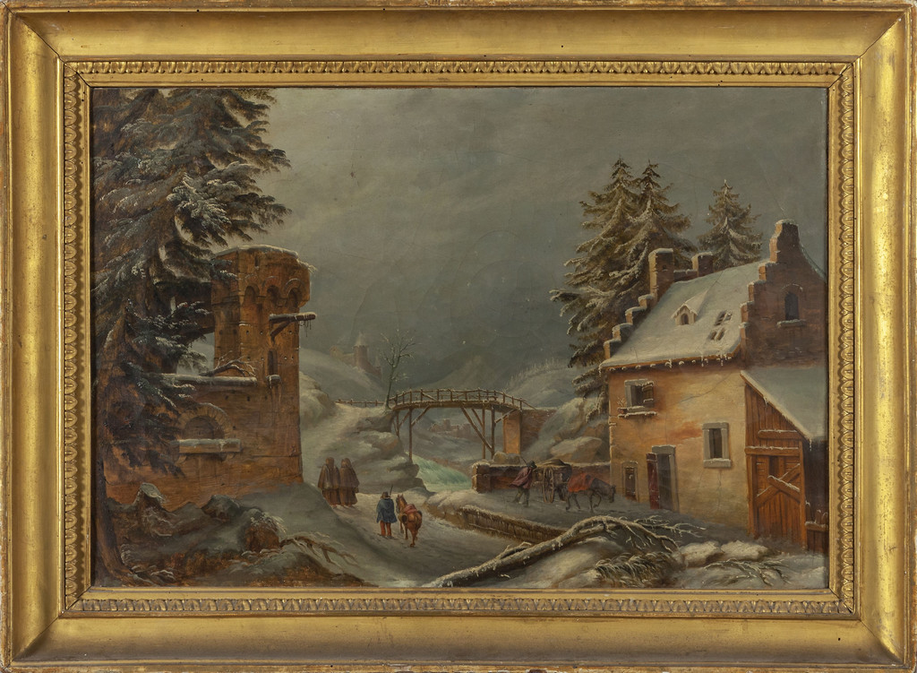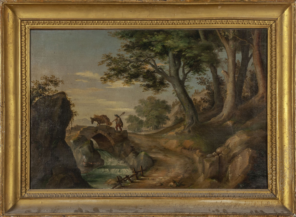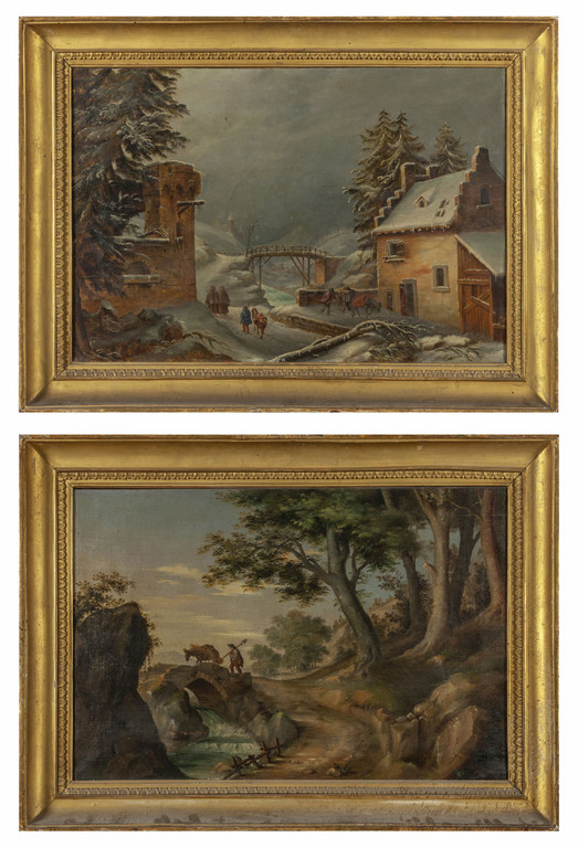 'Paesaggi animati con figure' coppia di olii sec.XIX cornici coeve in legno intagliato e dorato