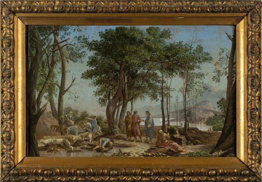 Scuola italiana sec.XVIII/XIX 'Paesaggio con personaggi lungo il fiume' olio