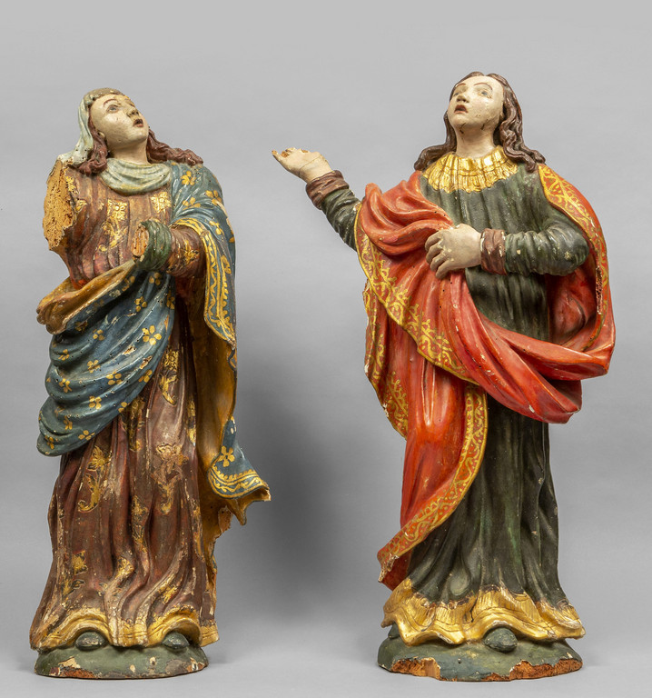 Sante coppia di sculture in legno intagliato dorato e laccato sec.XVIII
