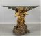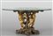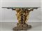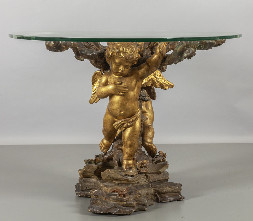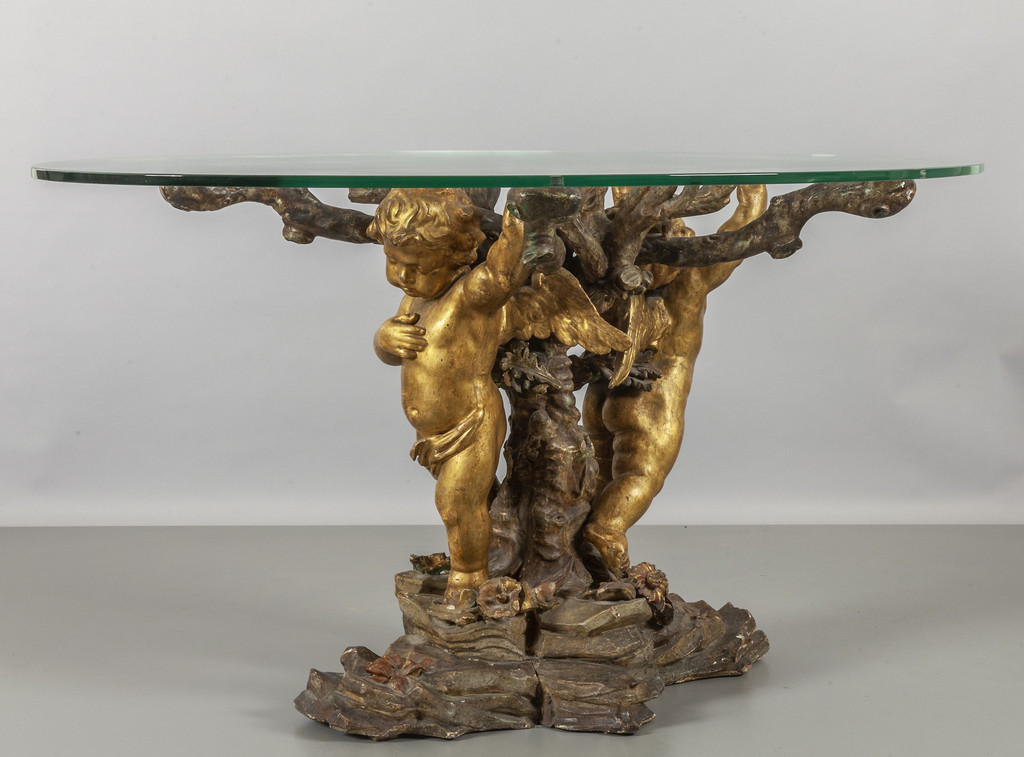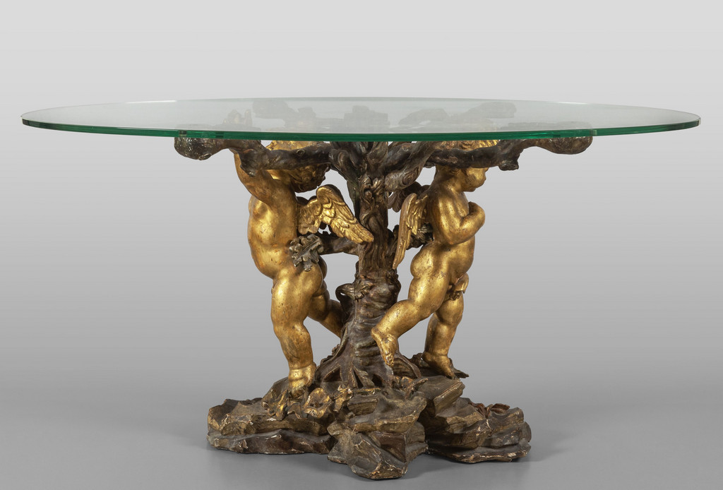 Base per tavolo in legno intagliato laccato e dorato raffigurante due putti intorno ad un tronco su base a roccaille che sorreggono un piano in cristallo Genova sec.XIX