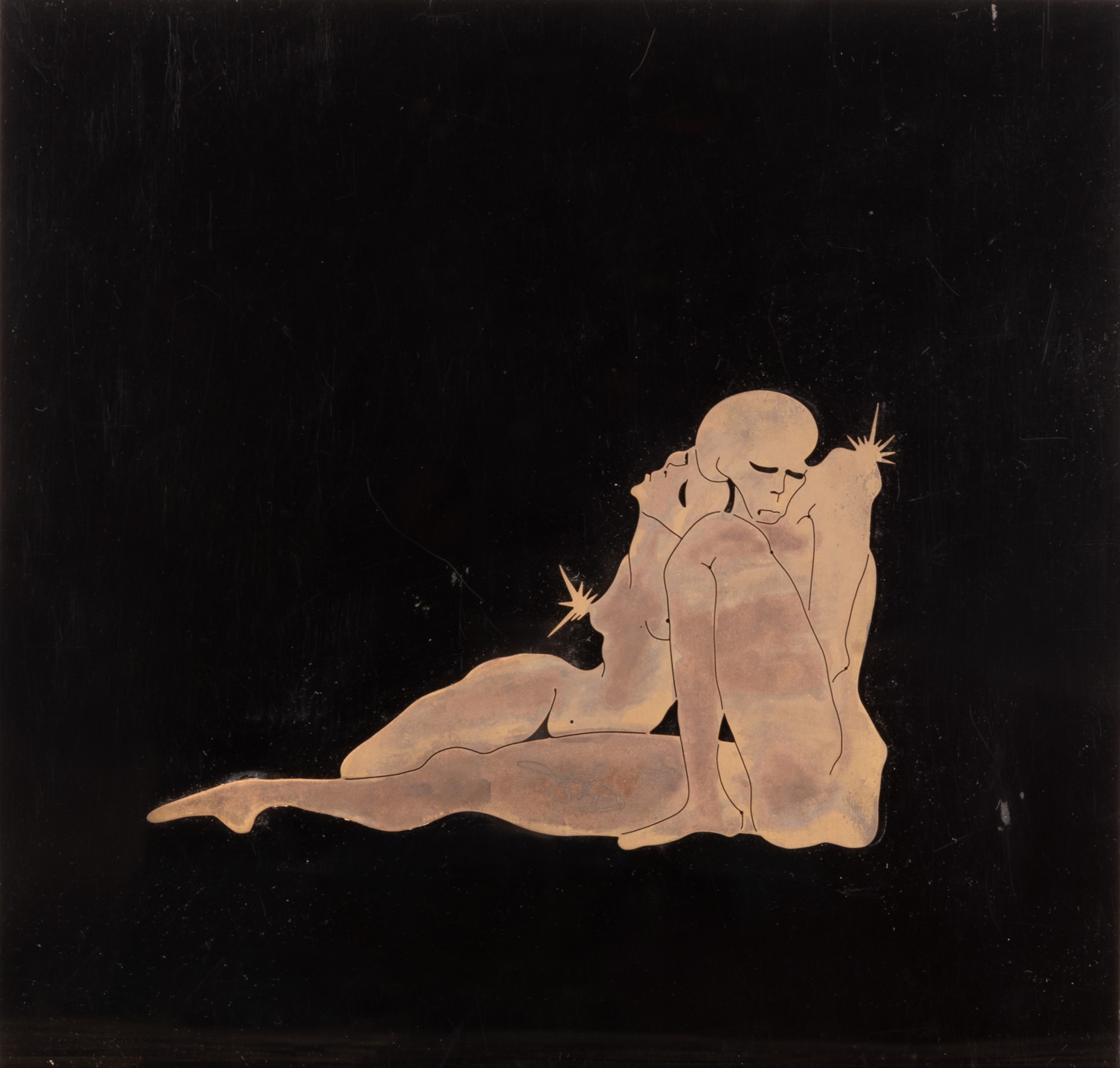 Salvador Dalì (Figueres, 1904 - Figueres, 1989) Gli amanti Multiplo cm 25x26 Multiplo in metallo applicato su plexiglass nero