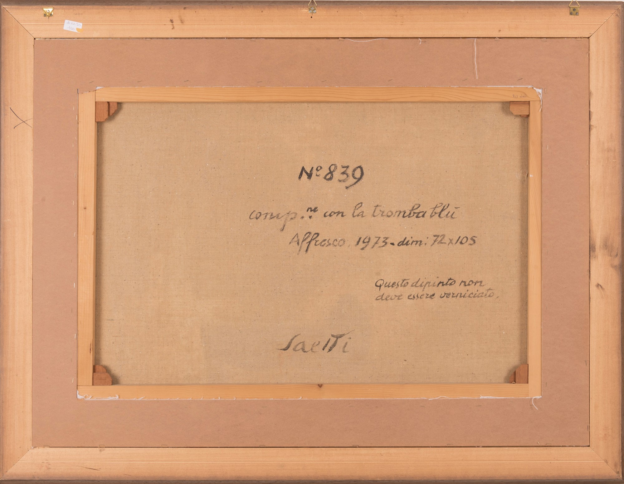Bruno Saetti (Bologna, 1902 - Bologna, 1984) Composizione con la tromba blu Affresco cm 74x107; con cornice cm 108x139 1973