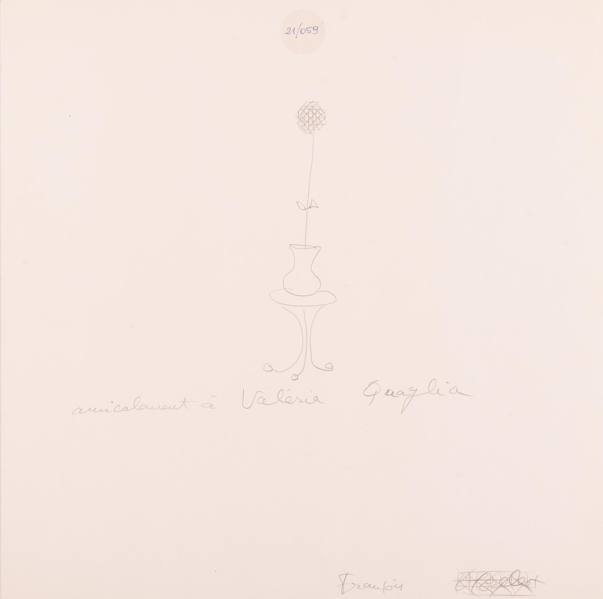 La sesta con dedica e schizzo dell'autore sul retro "Amicalement à Valeria Quaglia". Numero di inventario 21/059