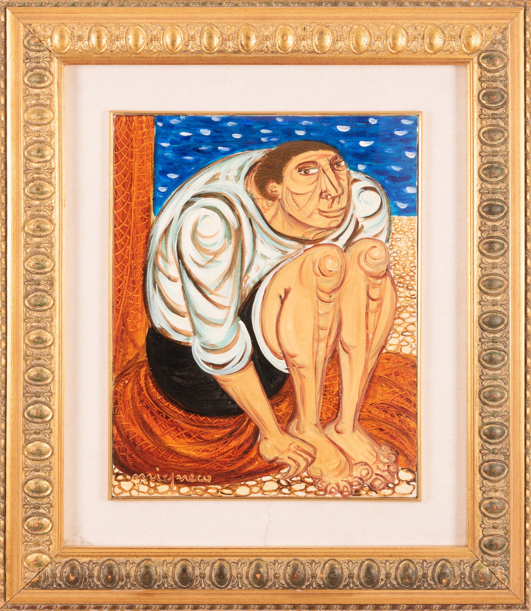 Giuseppe Migneco (Messina, 09/02/1903 - Milano, 28/02/1997) Pescatore a riposo Olio su tela cm 50x40; con cornice cm 80x70 1989