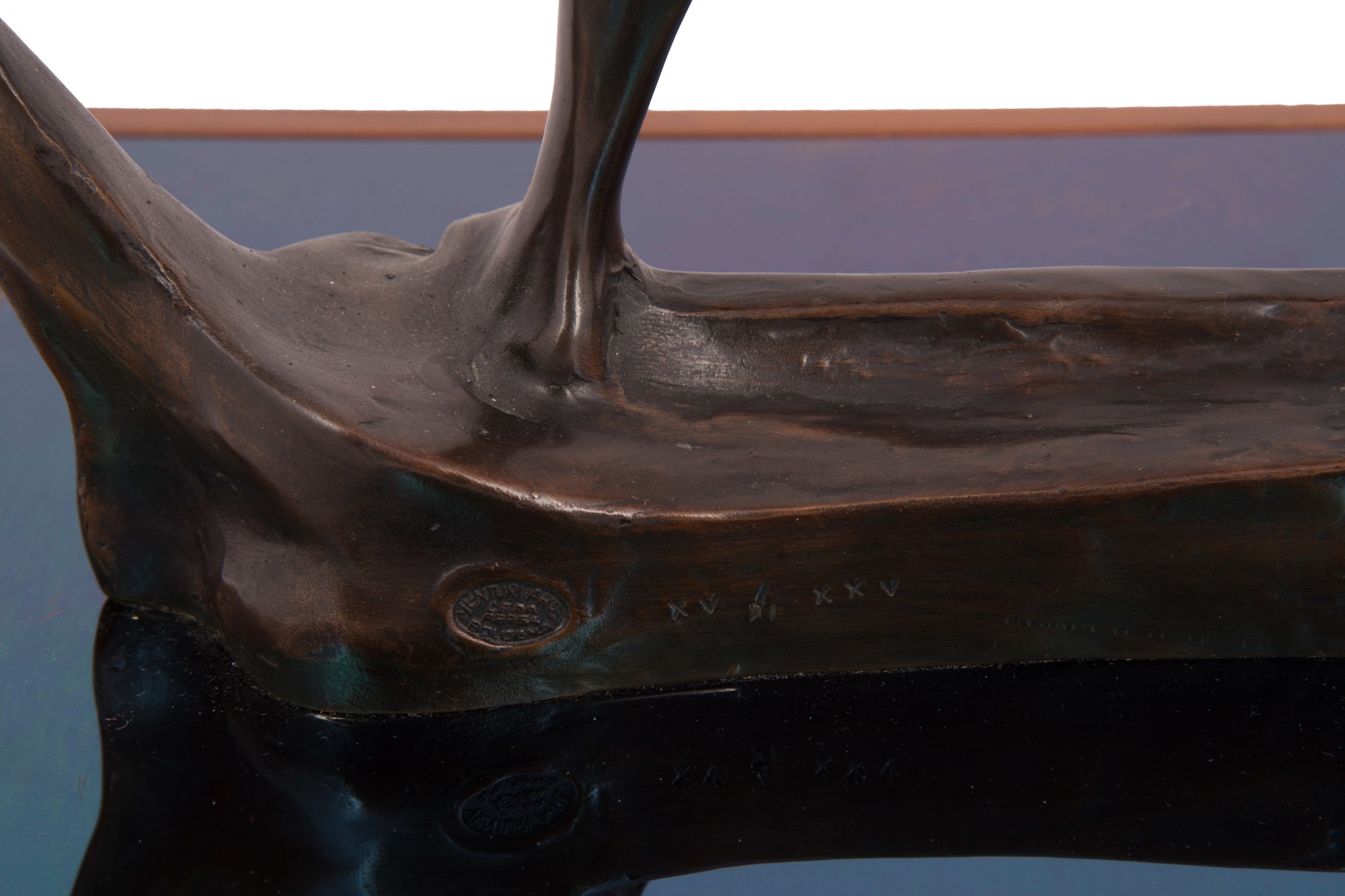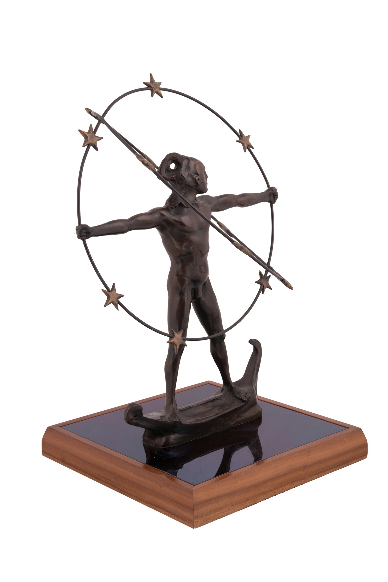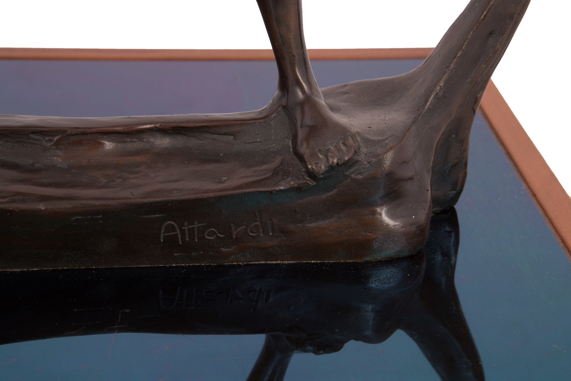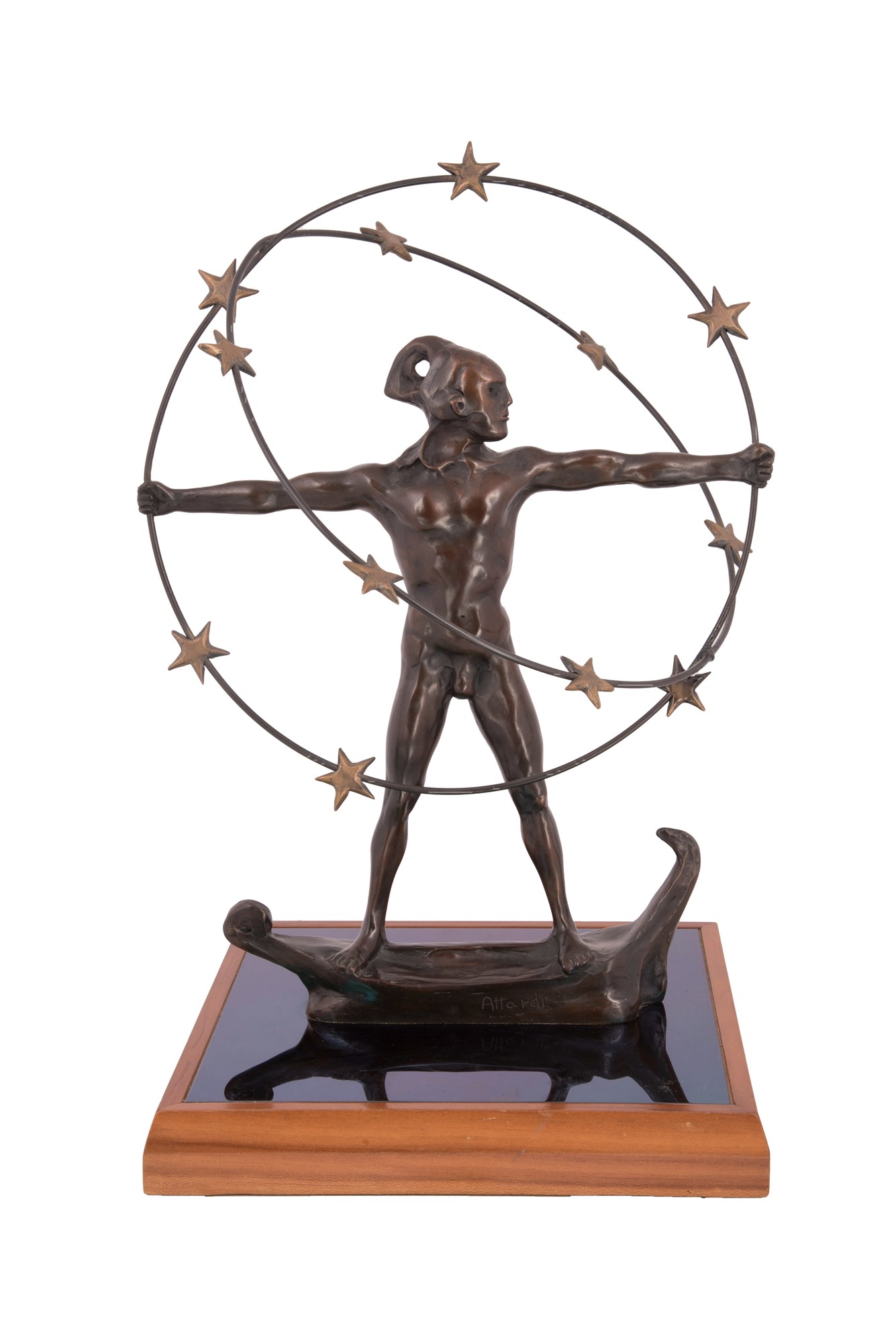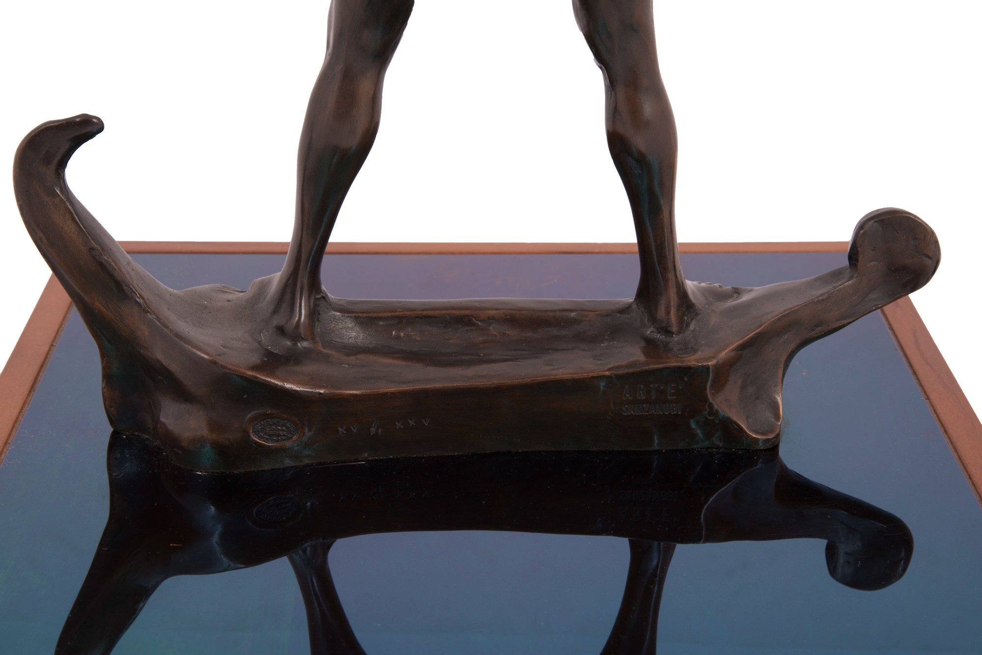 Ugo Attardi (Genova, 12/03/1923 - Roma, 21/07/2006) L'uomo e l'aurora Scultura in bronzo su lastra in acciaio a specchio su base in legno cm 48x35x4,5