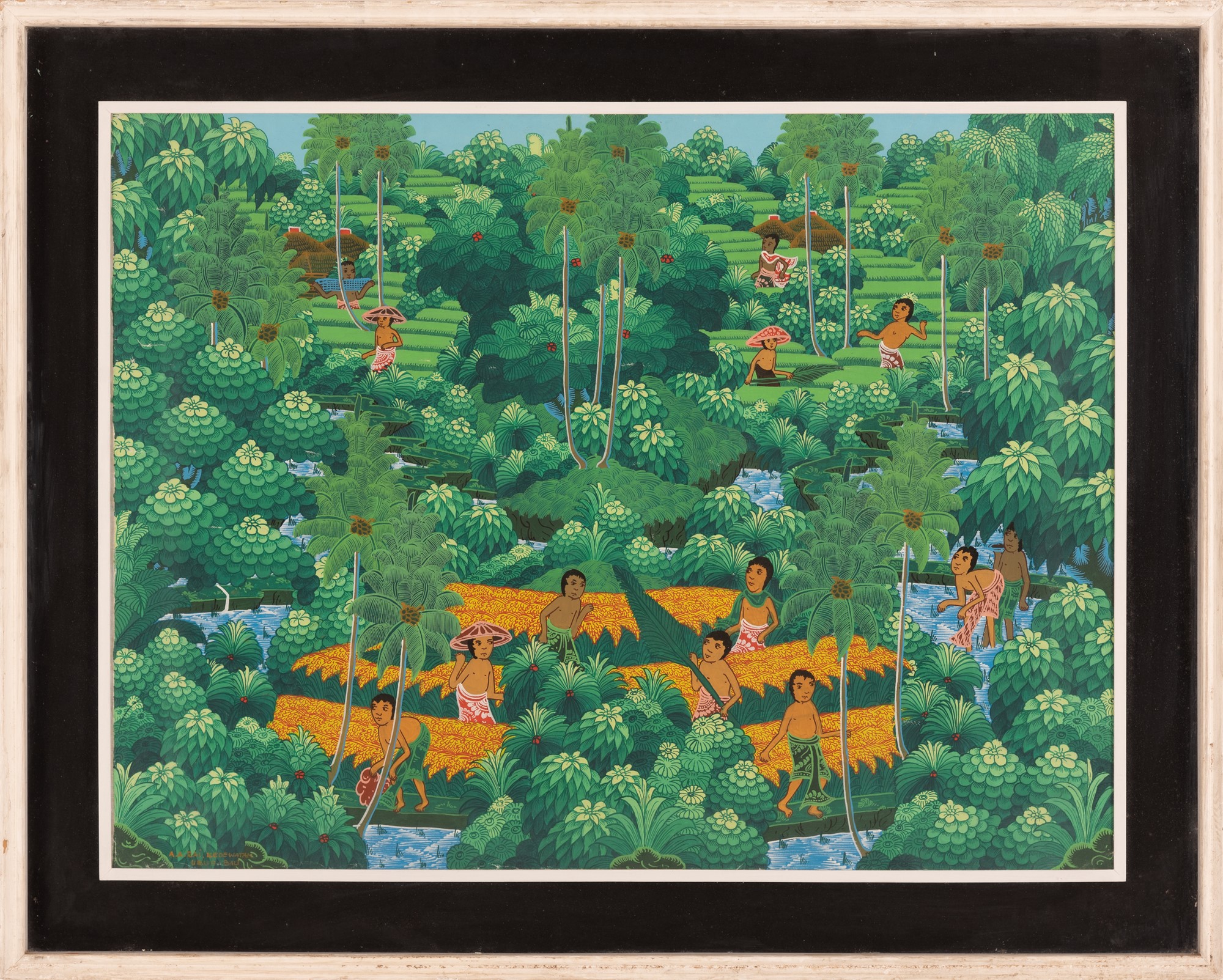 A.A.Rai (Bali, XX secolo - ) Kedewatam Ubud Bali Olio su tela cm 65x85; con cornice cm 83x105 Firma e titolo in basso a sinistra 350