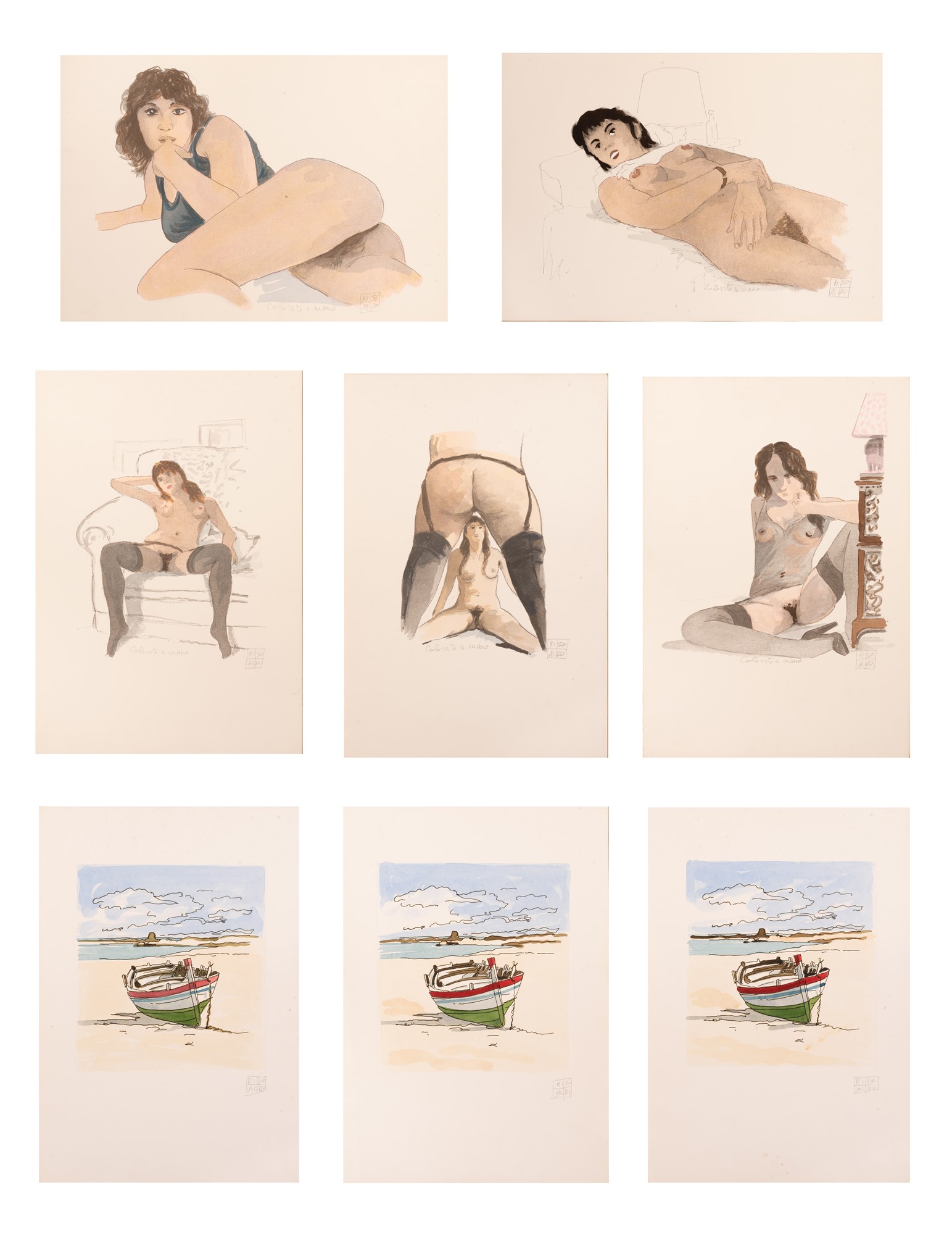 Aldo Riso (Santa Maria di Leuca, 1929 - 2009) Lotto di 8 serigrafie: 5 nudi e 3 marine Serigrafie cm 51x36