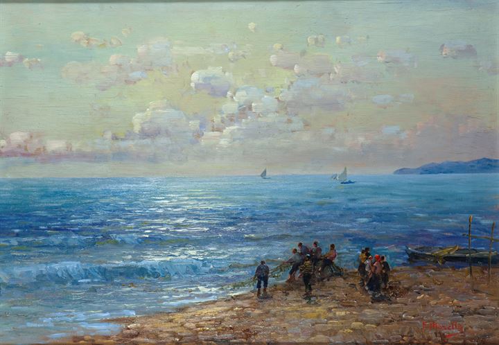 MORELLO FEDERICO Napoli 1885 - ? "Tirando le reti" 50x70 olio su tavola Opera...