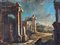 Veduta di rovine di architetture classiche ed edifici in lontananza. La distante città sullo sfondo e la vastità dei ruderi, insieme alle ridotte dimensioni dei personaggi sparsi qua e là, determinano un effetto di grande suggestione. La tela si presenta entro cornice in stile Luigi XV, in pastiglia dorata e realizzata nel XIX secolo.