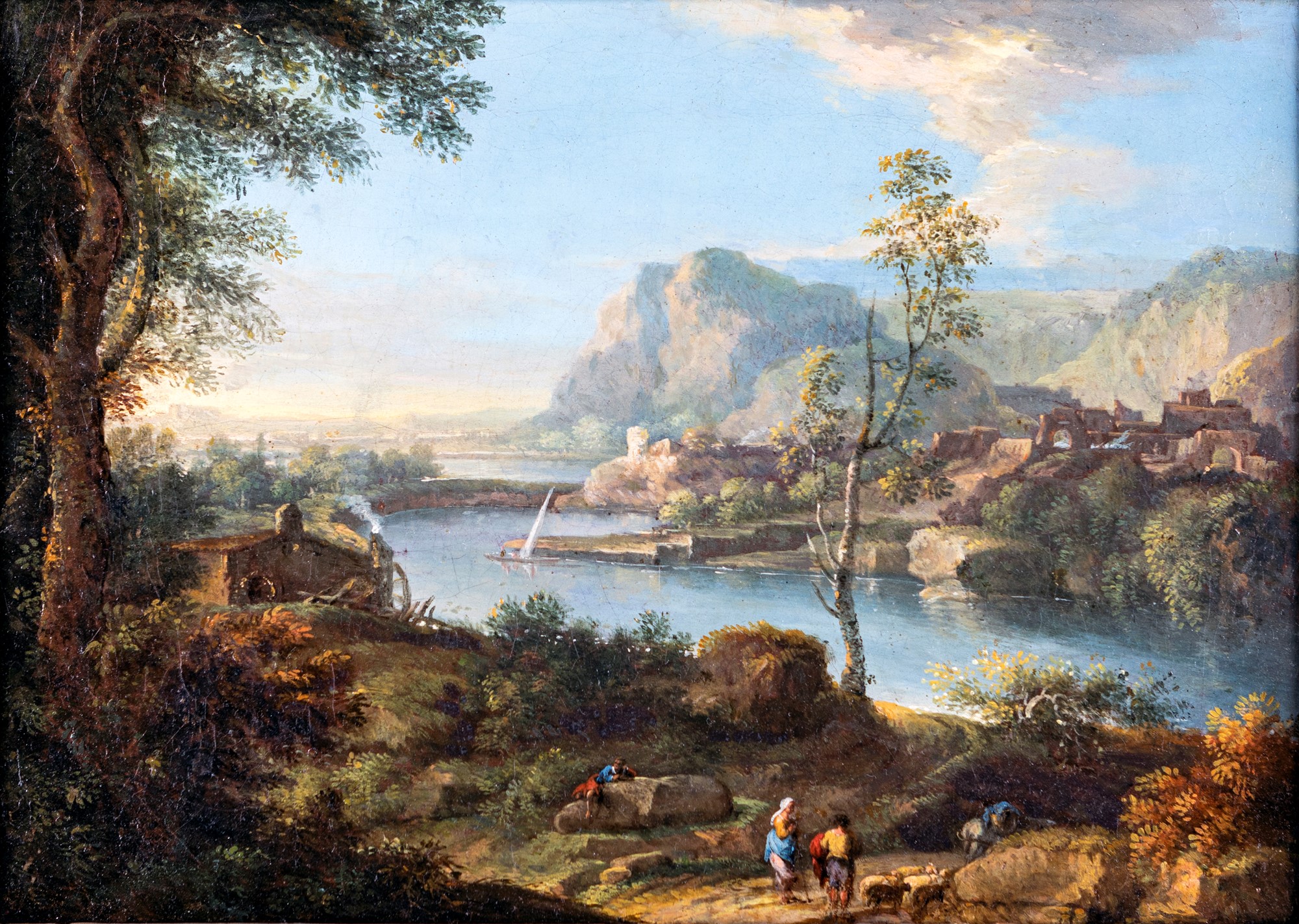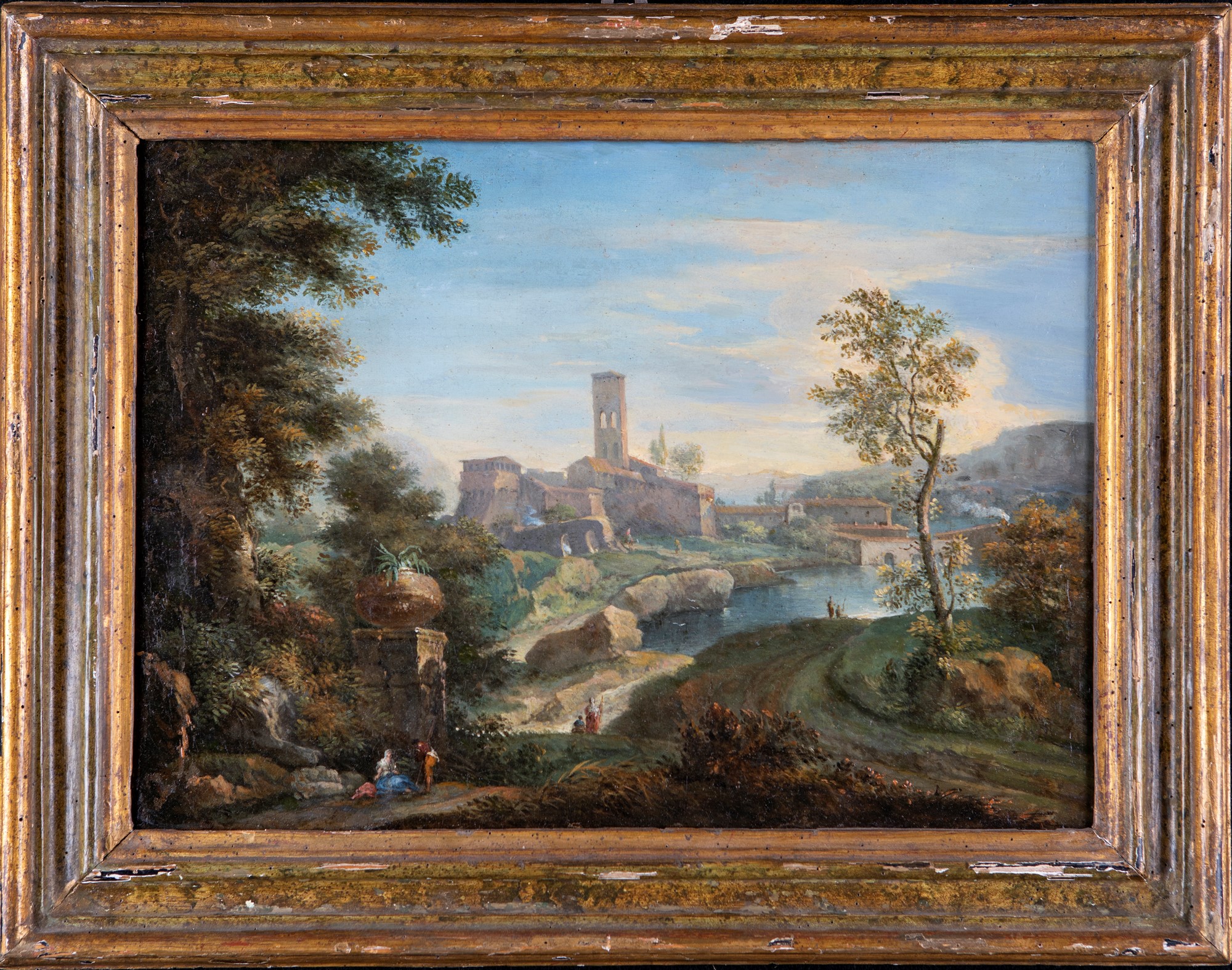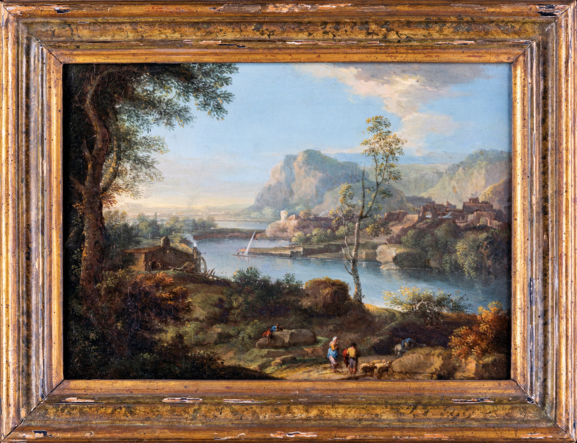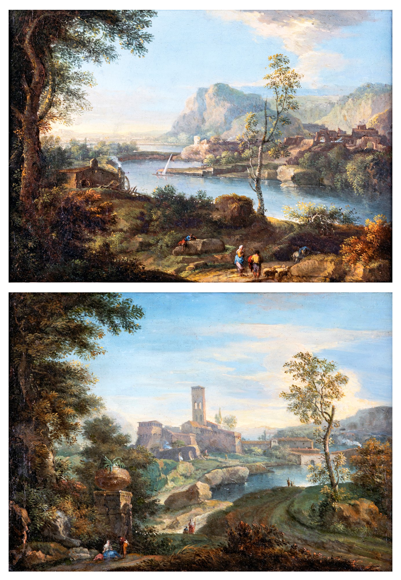 Paolo Anesi (Roma, 1697 - Roma, 1773) Coppia di vedute con paesaggi fluviali Coppia di olii su tela cm 34x47 - in cornice: 48x62