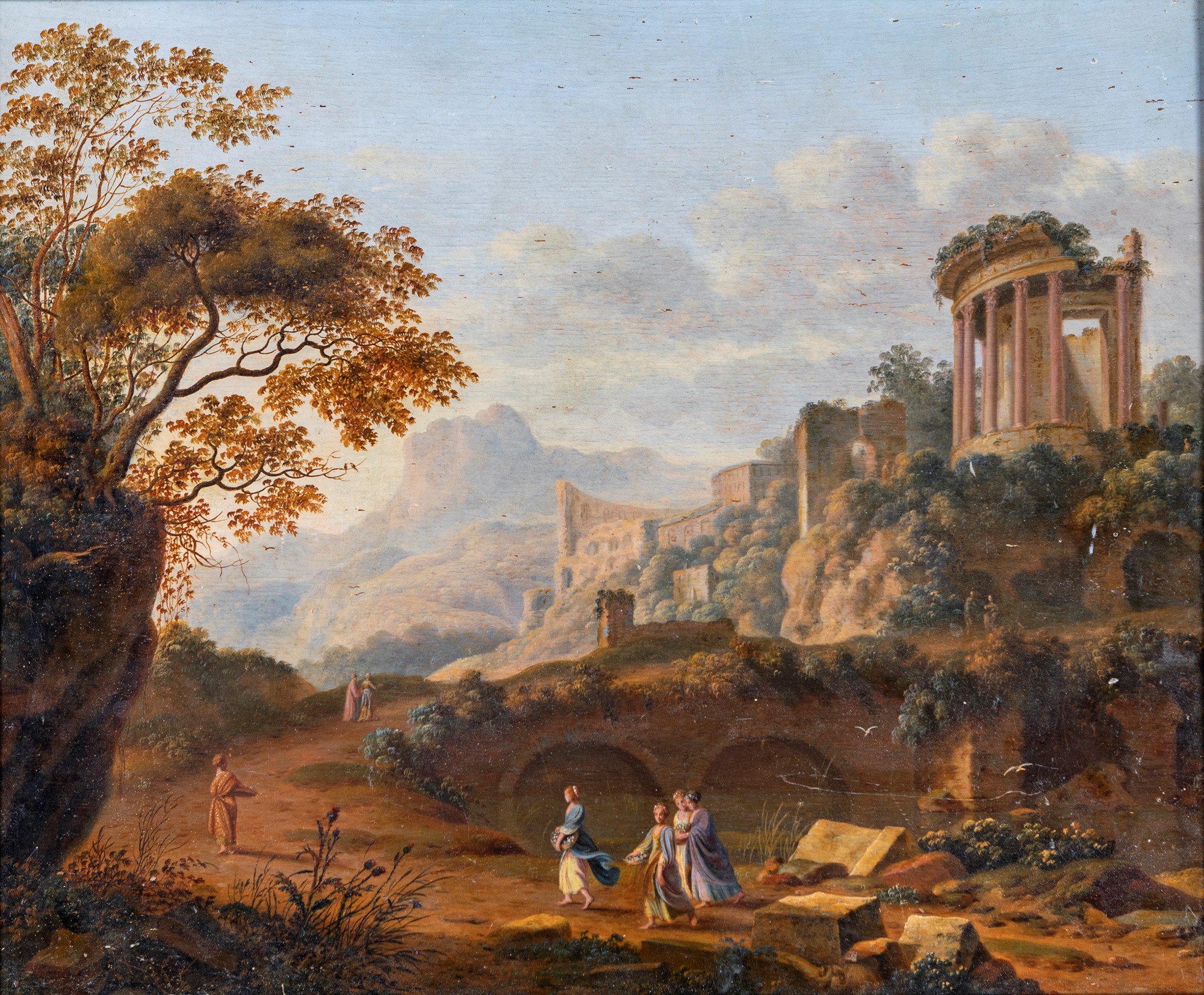Piacevole paesaggio con tempio e donne che portano fiori. Lo schema compositivo, armonico ed equilibrato, e le luminose cromie, suggeriscono la mano di un artista francese influenzato dai moduli formali di Claude Lorrain. Il tempio sulla destra rimanda a quello della Sibillia a Tivoli. L'opera è corredata da una cornice in stie Impero, in pastiglia e con decorazioni a palmette.