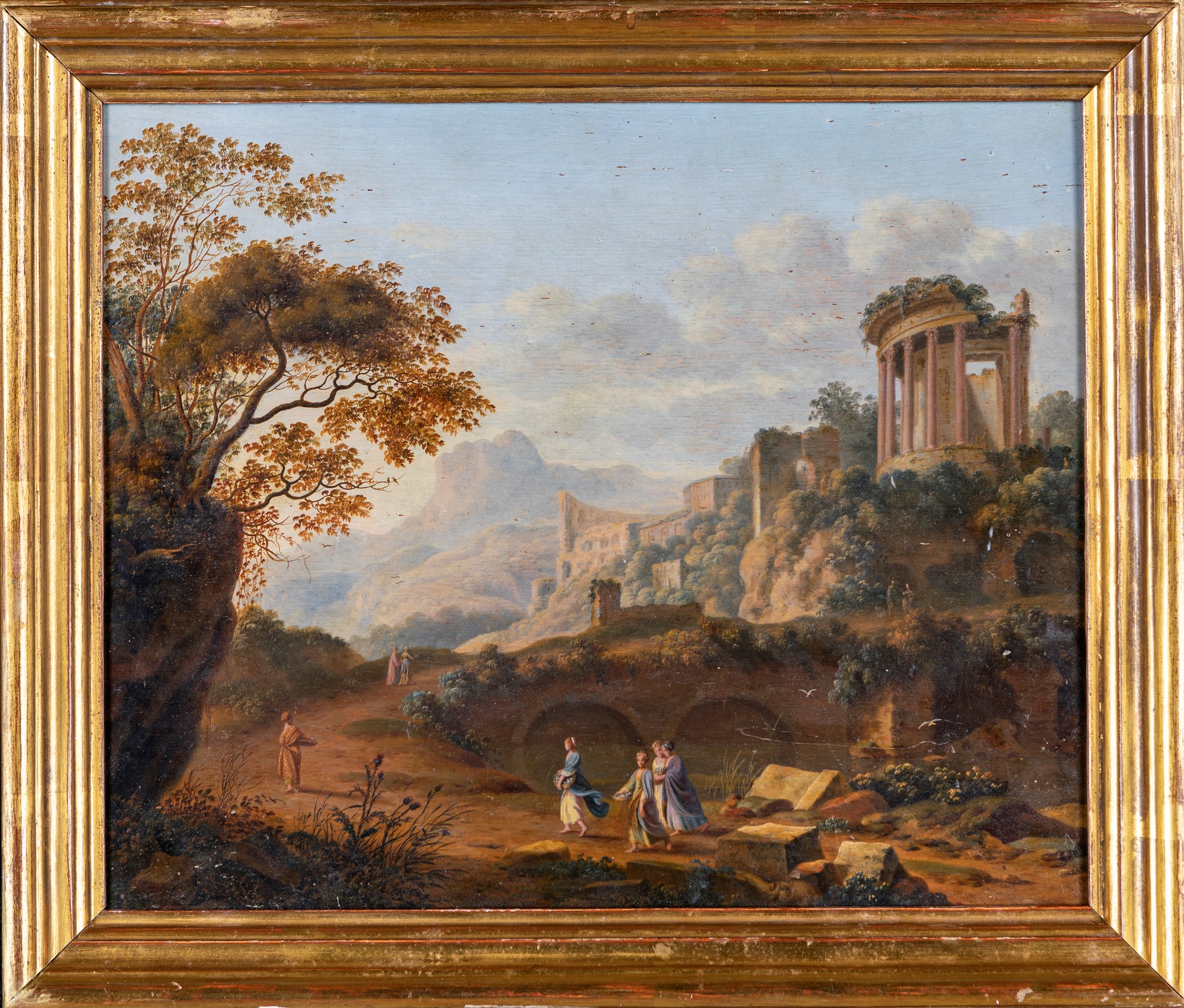 Scuola francese del XVIII secolo (0 - 0) Veduta di paesaggio con tempio Olio su tavola cm 34x41 - in cornice: 42x48