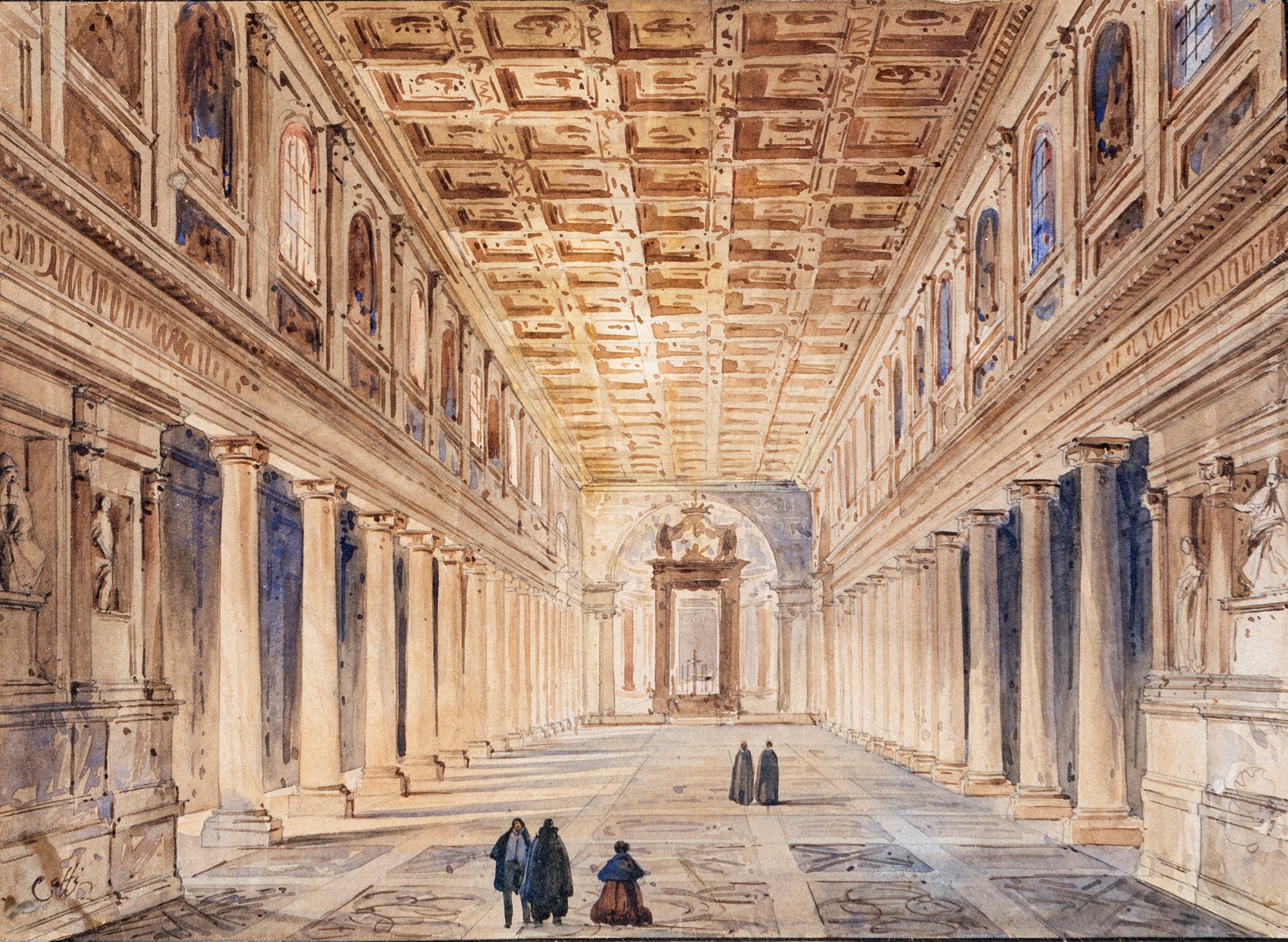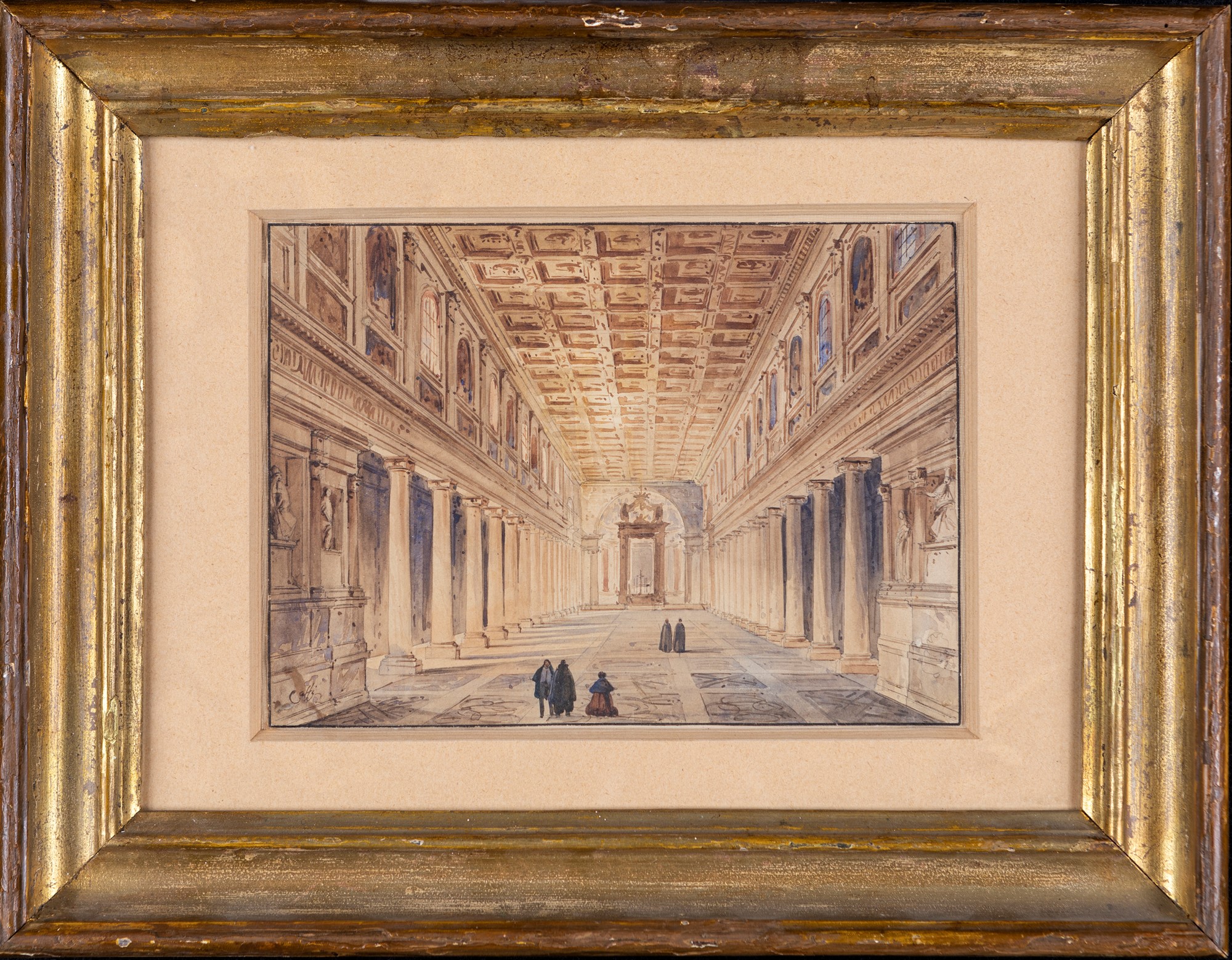 Ippolito Caffi (Belluno, 1809 - Mare Adriatico, 1866) Veduta dell'interno della Basilica di Santa Maria Maggiore acquerelli su carta cm 20x27 - in cornice: 37x48