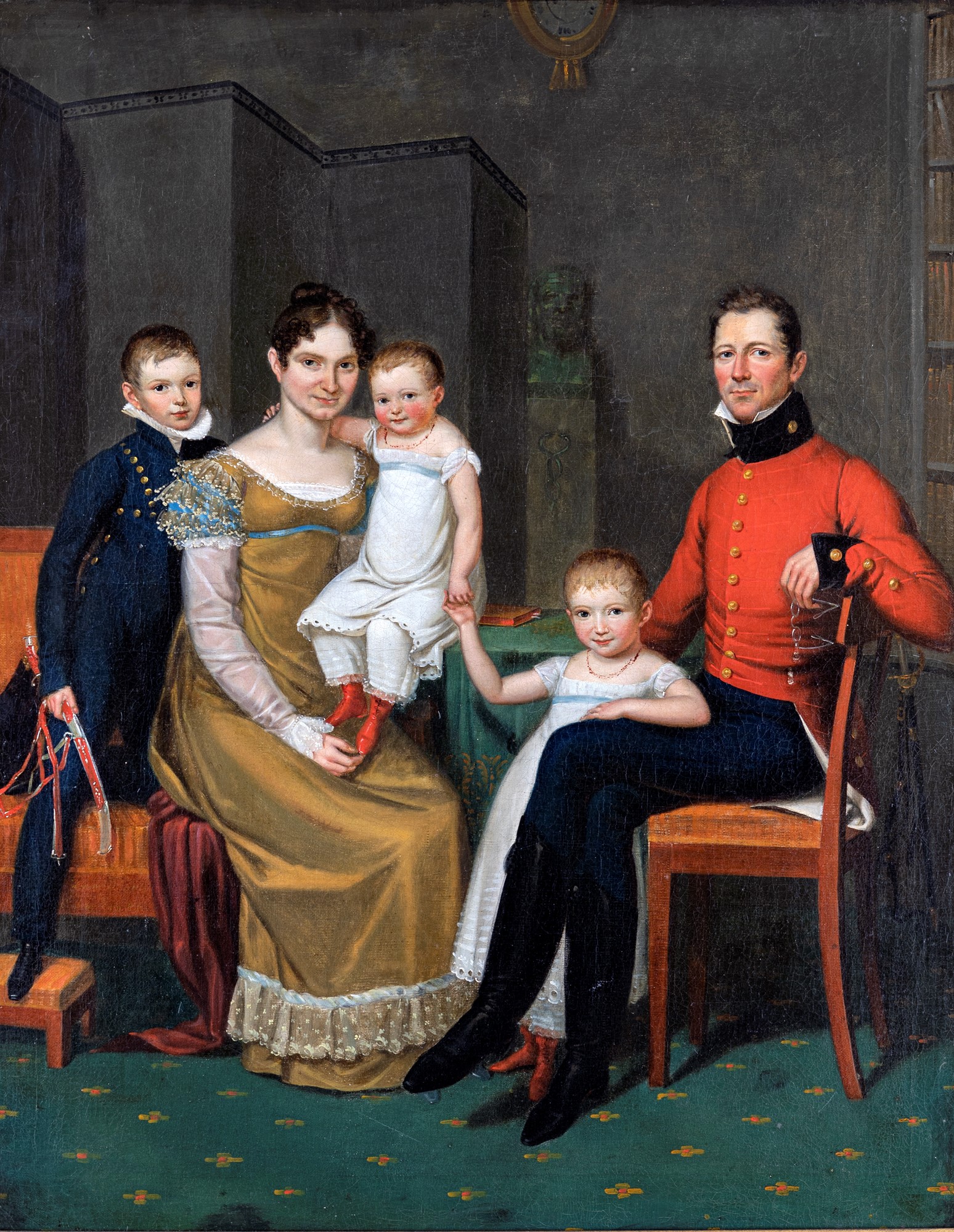 Il pregiato dipinto raffigura i membri di una famiglia, espressivi e ben vestiti, ritratti all'interno di una abitazione borghese. L'opera rappresenta un interessante esempio della ritrattistica di famiglia dei primi decenni dell'Ottocento, in cui vediamo il configurarsi di una declinazione più intimistica e domestica rispetto ai fastosi esempi dei dipinti del primo Neoclassicismo. Il carattere di semplicità e, potremmo dire, "understatement" della raffigurazione della famiglia, priva di sfarzo ma non di dignità, molto suggerisce sui profondi cambiamenti sociali di quei movimentati decenni. La tela, ben conservata, si presenta entro una cornice in legno dorato, coerente con la pittura e databile ai primi decenni dell' 800.