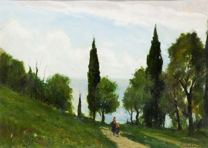 COLMO GIOVANNI Torino 1867 - 1947 "Paesaggio con figure" 30x43 olio su...