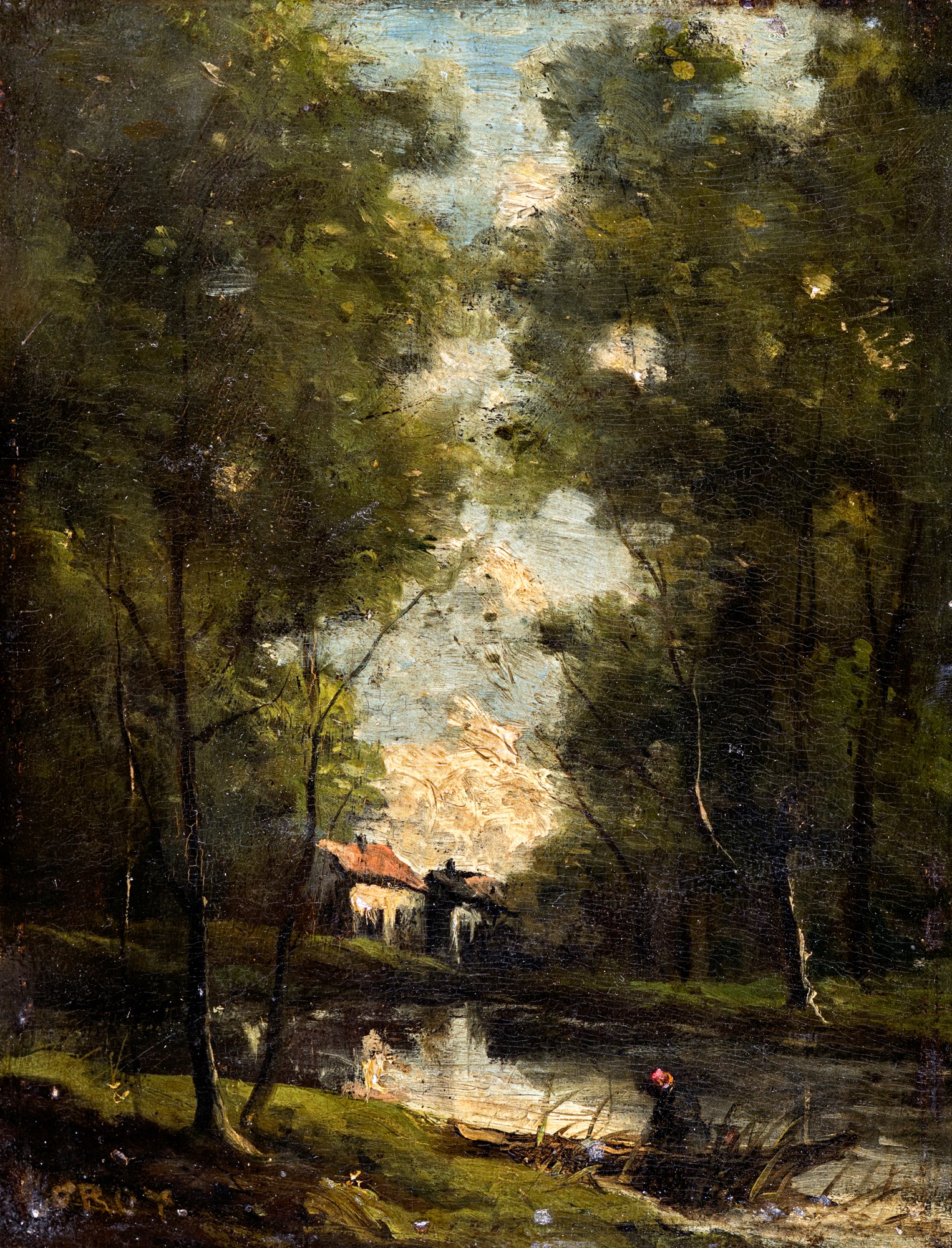 Jean-Baptiste Camille Corot (Parigi, 1796 - Parigi, 1875) Paesaggio boschivo con fiume e armenti Olio su tavola cm 24,5x19 - in cornice cm 51x42,5