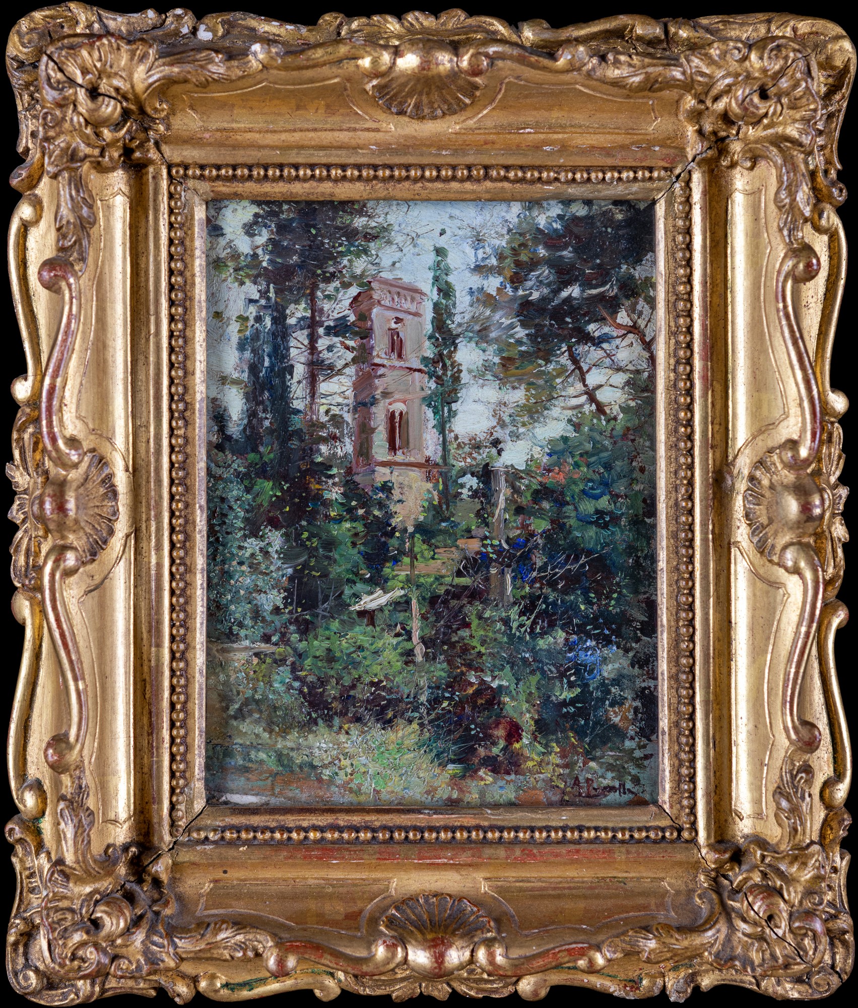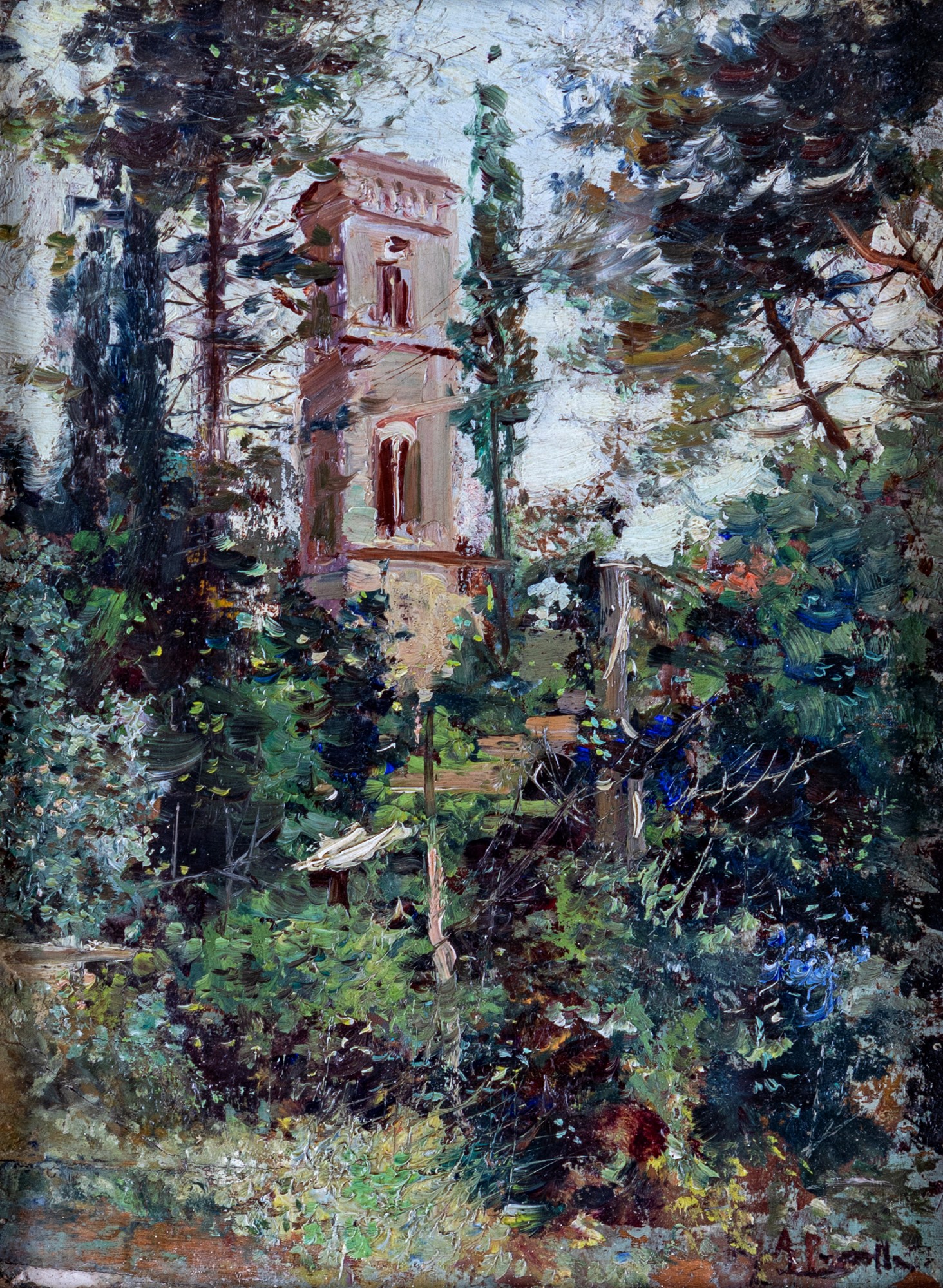 Attilio Pratella (Lugo, 1856 - Napoli, 1949) La torre nel bosco Olio su tavola cm 17,5x13