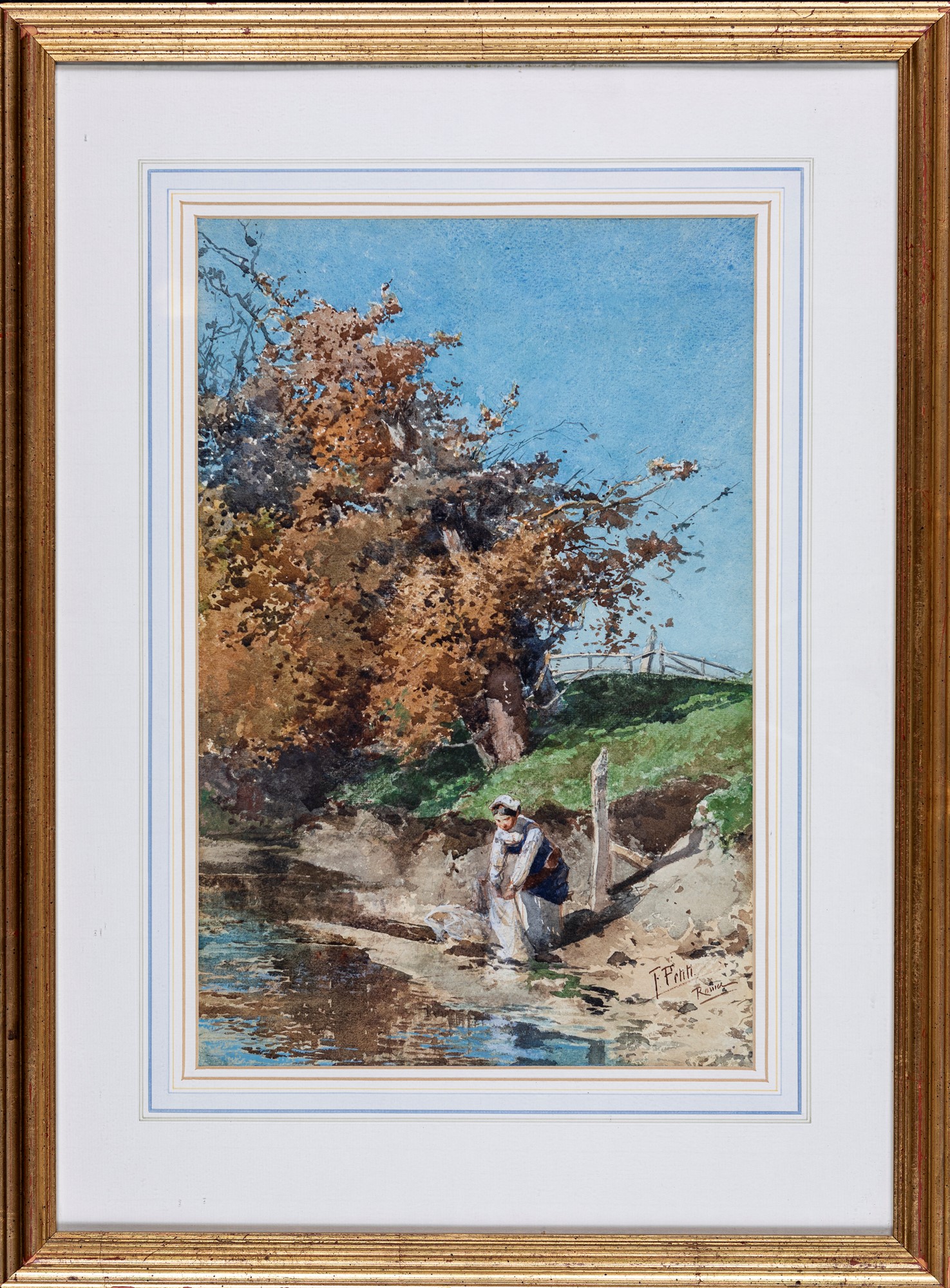 Filiberto Petiti (Torino, 1845 - Roma, 1924) Lavandaia al fiume Acquarello su carta cm 44,5x29,5