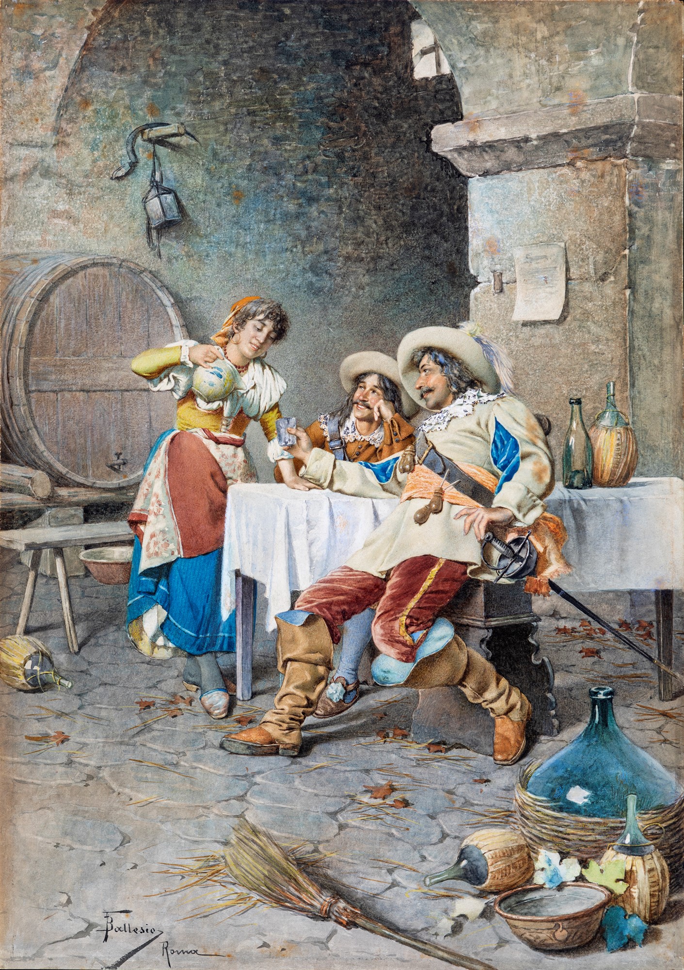 Francesco Ballesio (Torino, 1860 - Tivoli, 1923) Soldati all'osteria Acquarello e matita su carta applicata su cartoncino cm 50,5x35,5