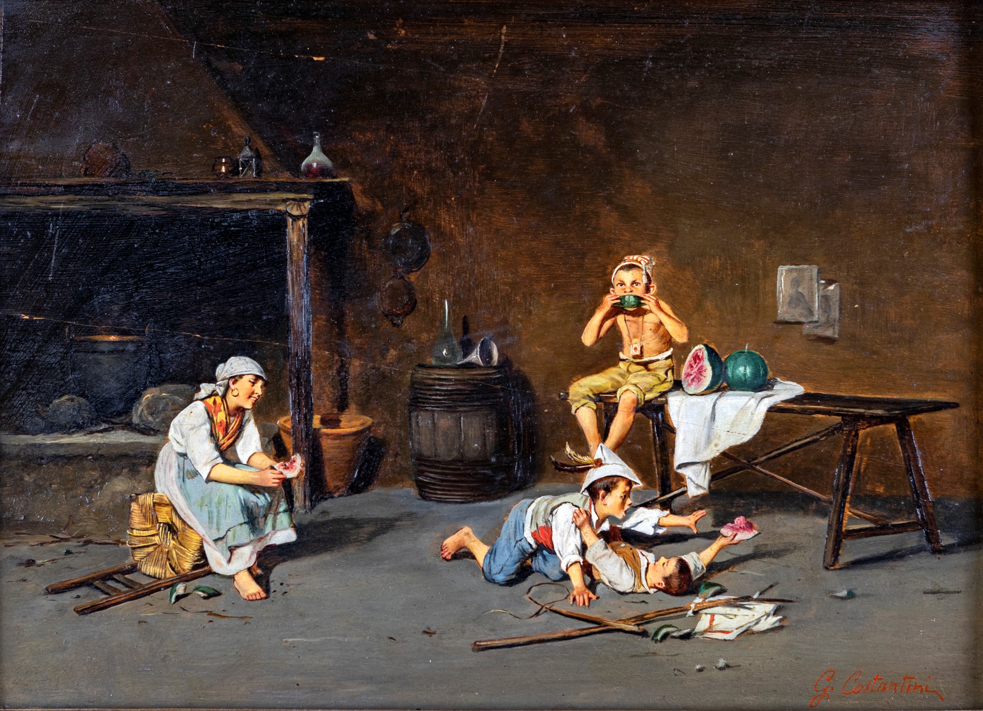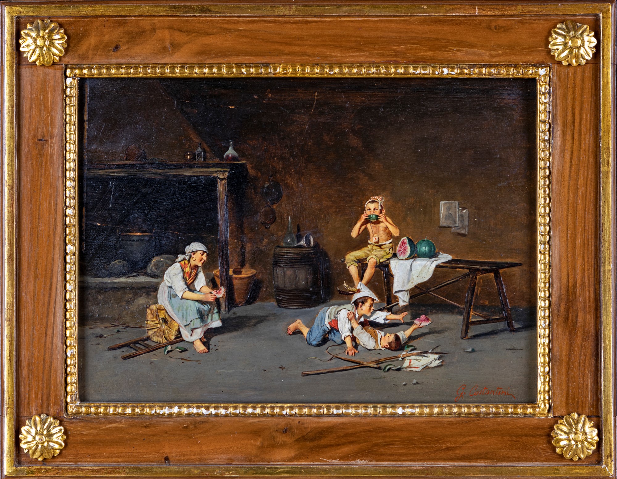 Giuseppe Costantini (Nola, 1844 - Napoli, 1894) La merenda con l'anguria Olio su tavola cm 27x37 - in cornice cm 37,5x48