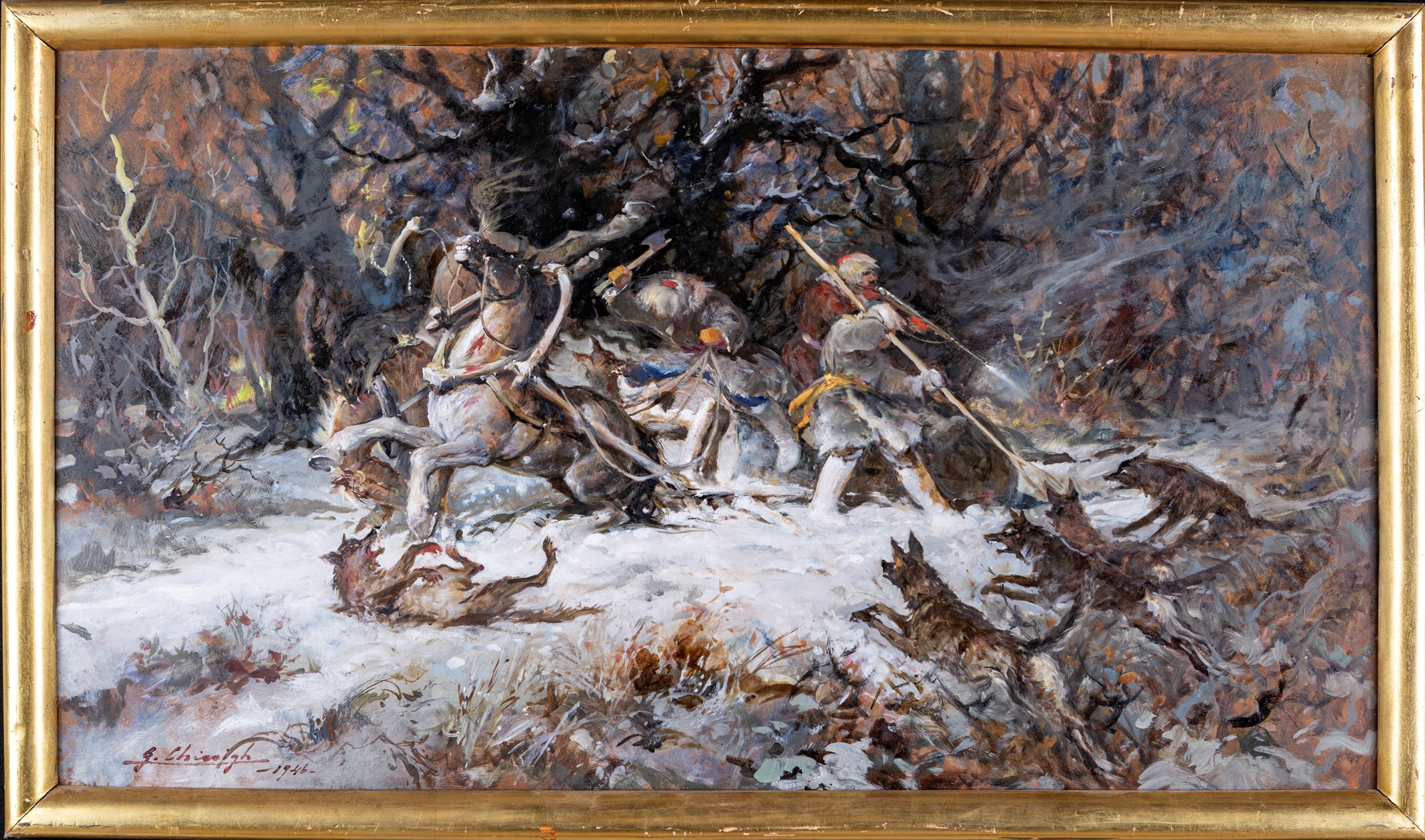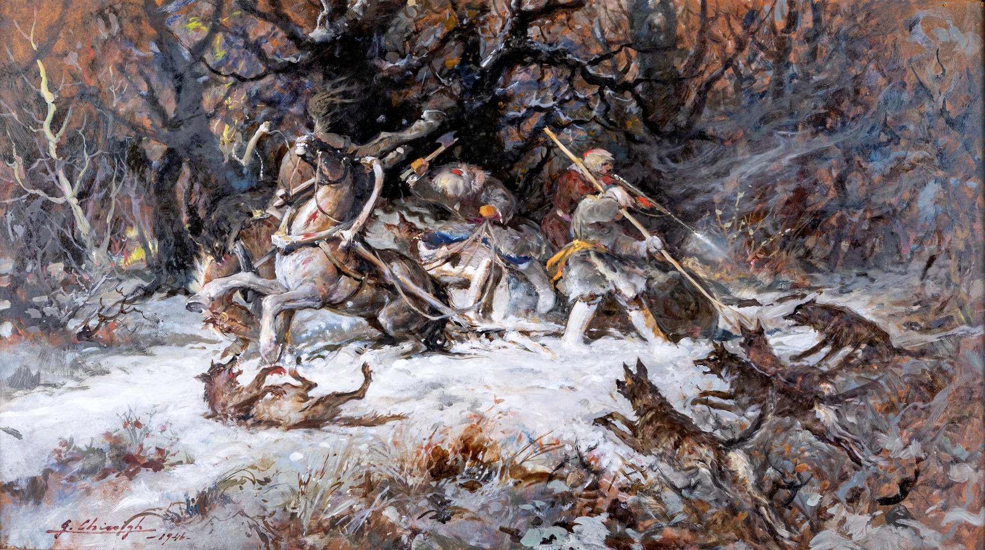 Giuseppe Chiacigh (Vladikavkaz, 1895 - Trieste, 1967) L'assalto alla slitta 1946 Olio su masonite cm 70x125
