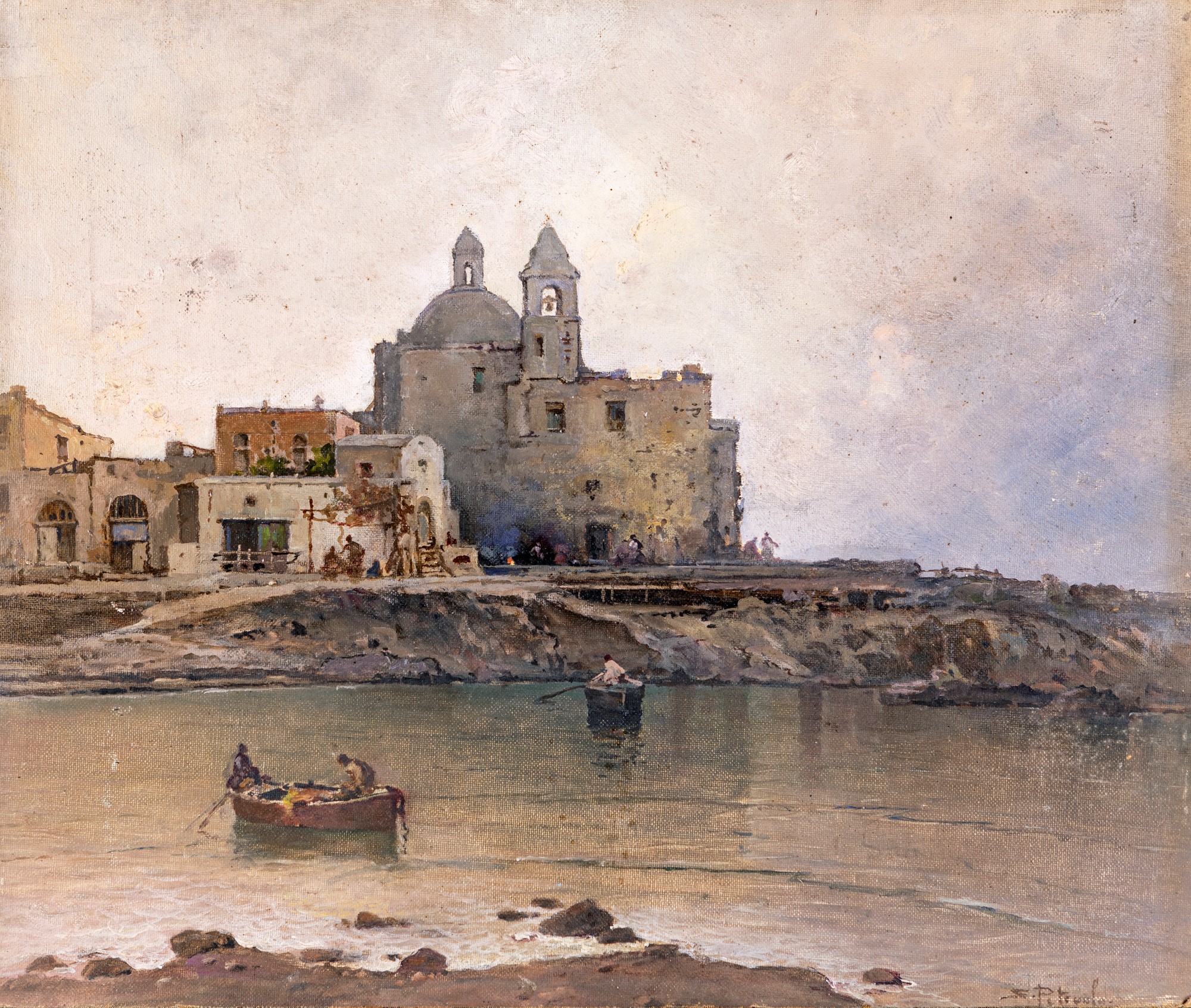 Salvatore Petruolo (Catanzaro, 1857 - Napoli, 1946) Costiera Amalfitana Olio cartone telato cm 40,5x48 - in cornice cm 52x58