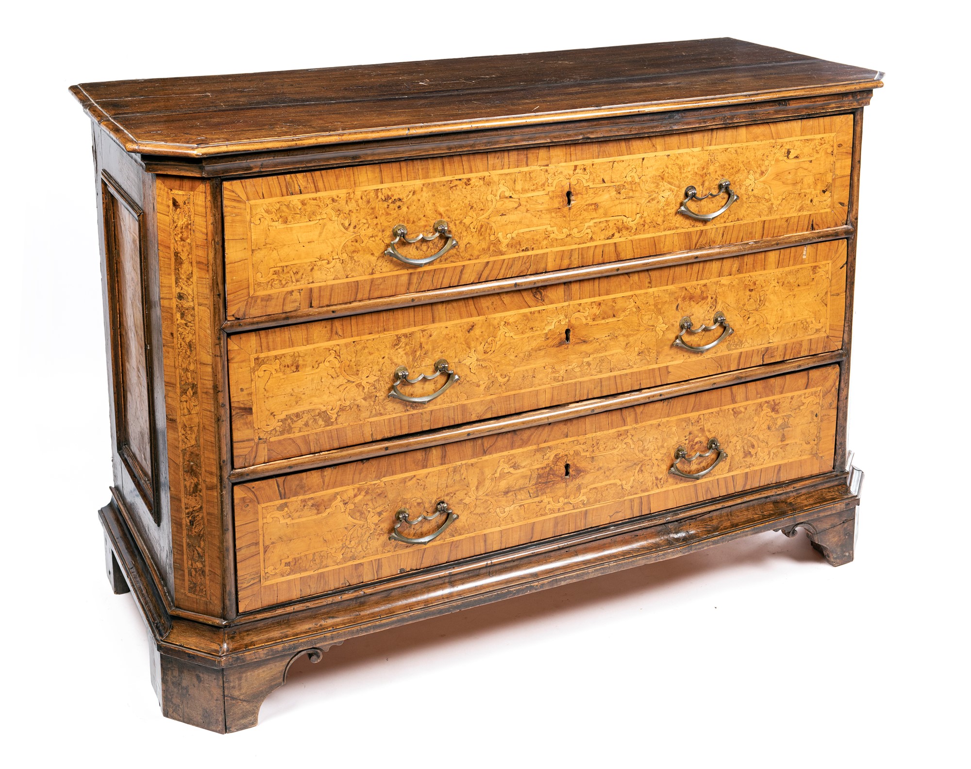 con specchi in radica racchiusi da filettatura lineare in legno di frutto, decorati da cartigli; piano lievemente sporgente con ciglio scantonato, tre cassetti in colonna frontali con maniglie in bronzo, piedi a mensola