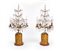 a quattro luci con candele in vetro lattimo; struttura arricchita da pendenti a goccia sfaccettata, prismi e rosette; poggianti su piedistalli a rocchio di colonna in legno dorato con fusto scanalato