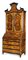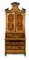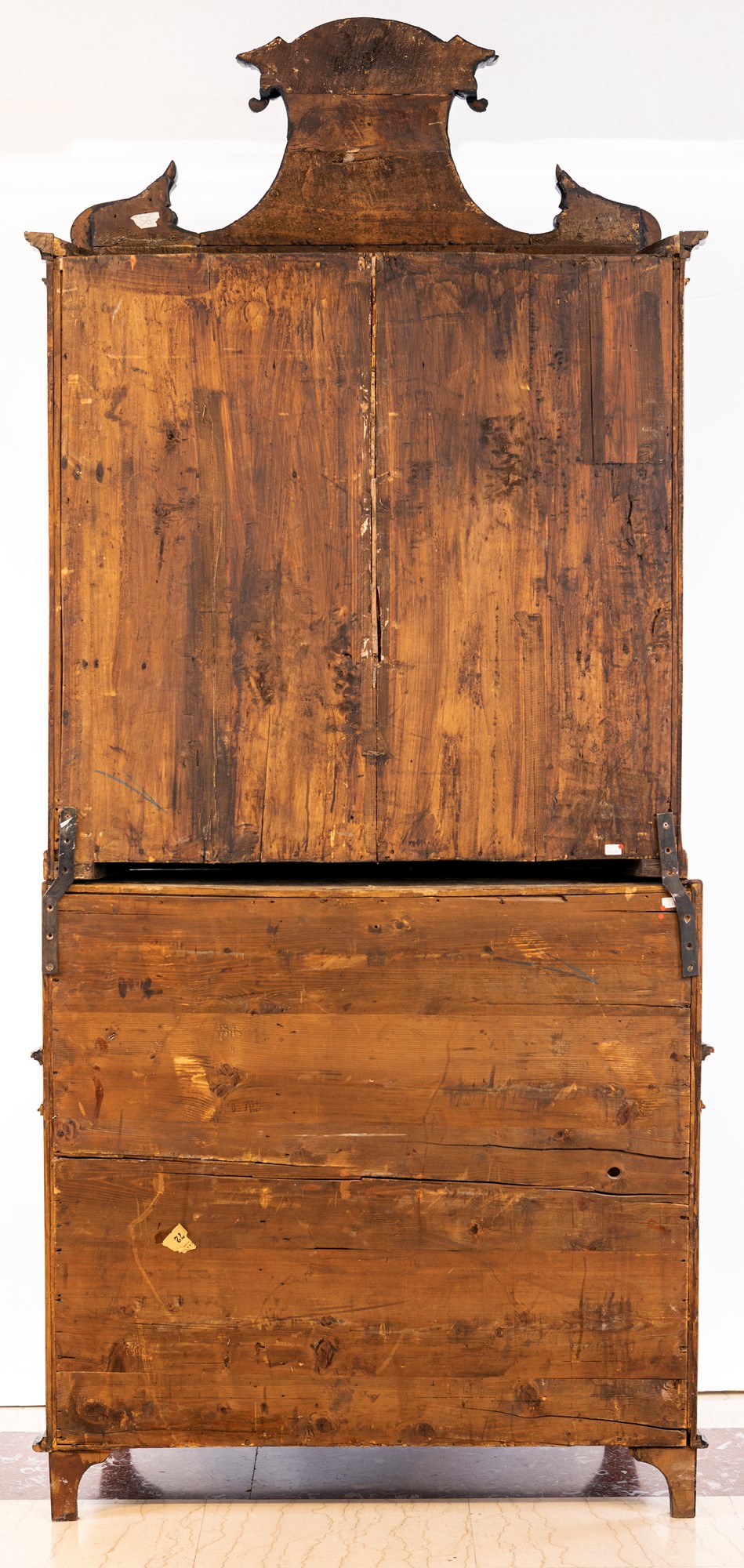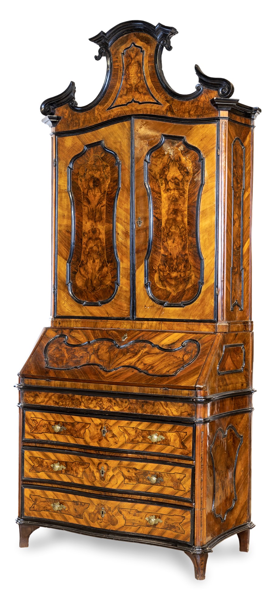 con cornici modanate in legno ebanizzato; corpo superiore con cimasa a timpano spezzato e due sportelli con ripiano interno; corpo inferiore a tre cassetti sormontati da anta a ribalta che cela sei tiretti interni e la porzione centrale del piano scorrevole. Piedi a pilastro