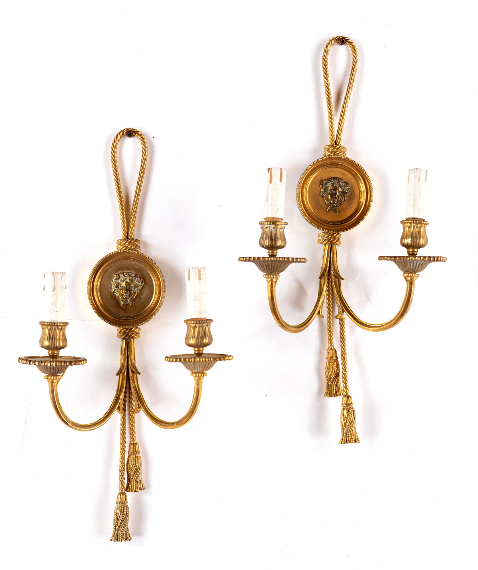 Lotto 214 | Coppia di appliques a due luci in bronzo dorato cm 52x25x13