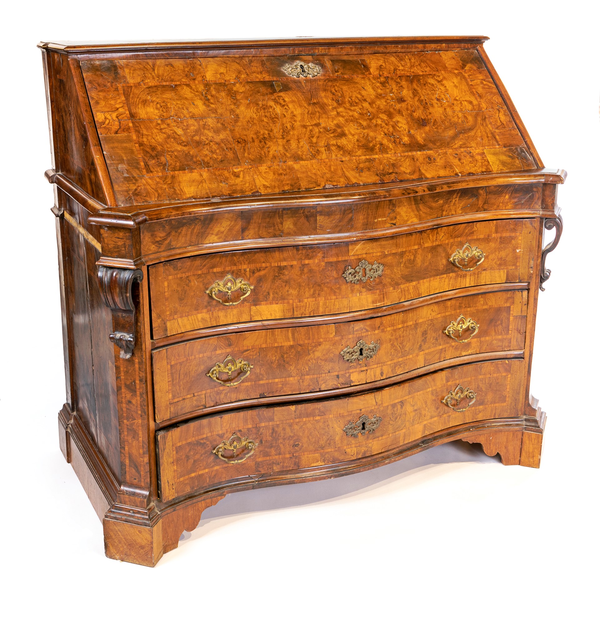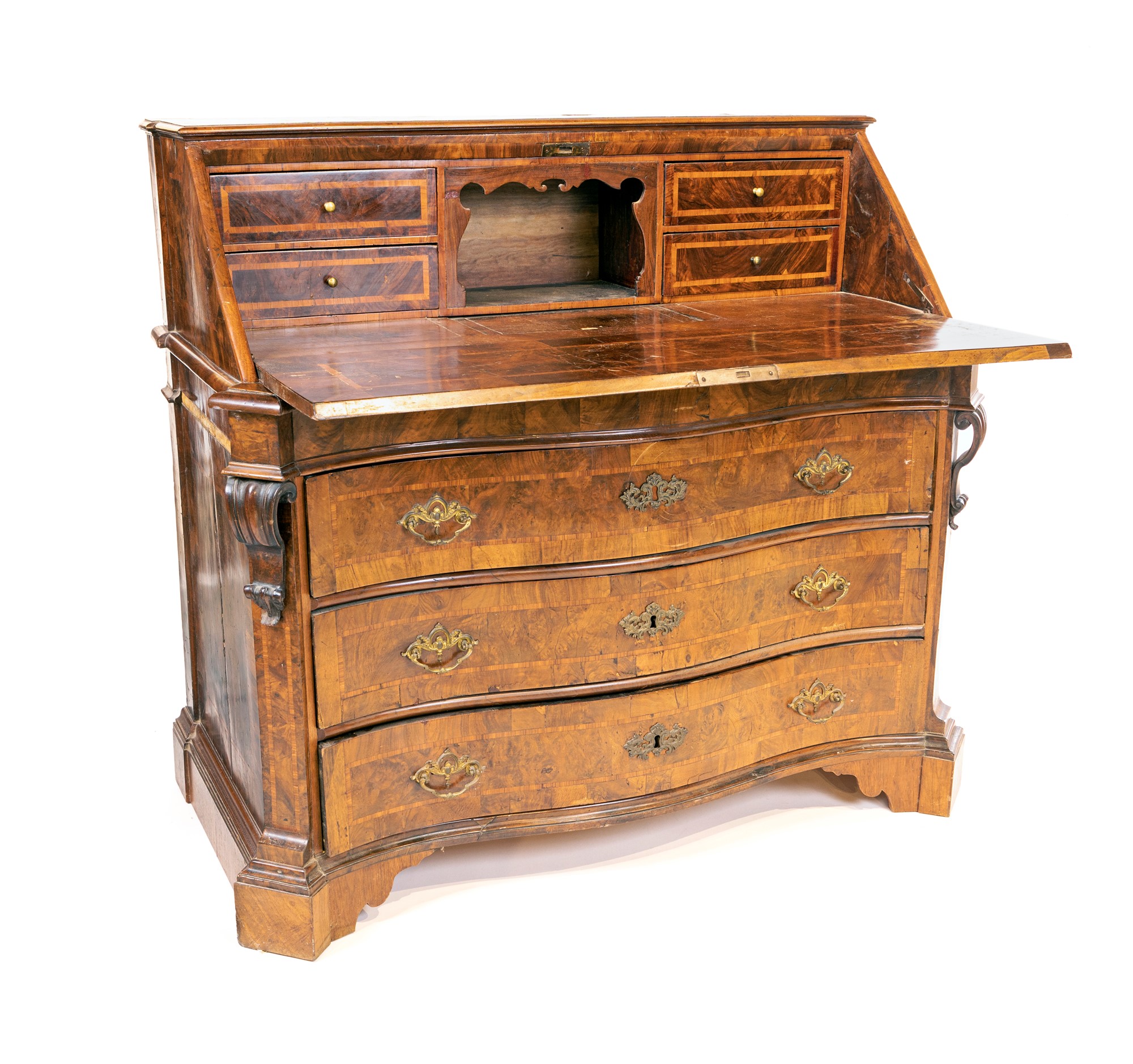 con pannelli incorniciati da filettature lineari in legno di rosa; facciata sagomata suddivisa in tre cassetti, delimitata da paraste angolari impreziosite da riccioli architettonici; la ribalta reca la porzione centrale del piano scorrevole con scomparti segreti interni ed ospita un vano centrale affiancato da due cassetti in colonna disposti ai lati; piedi a mensola. Difetti e rifacimenti