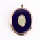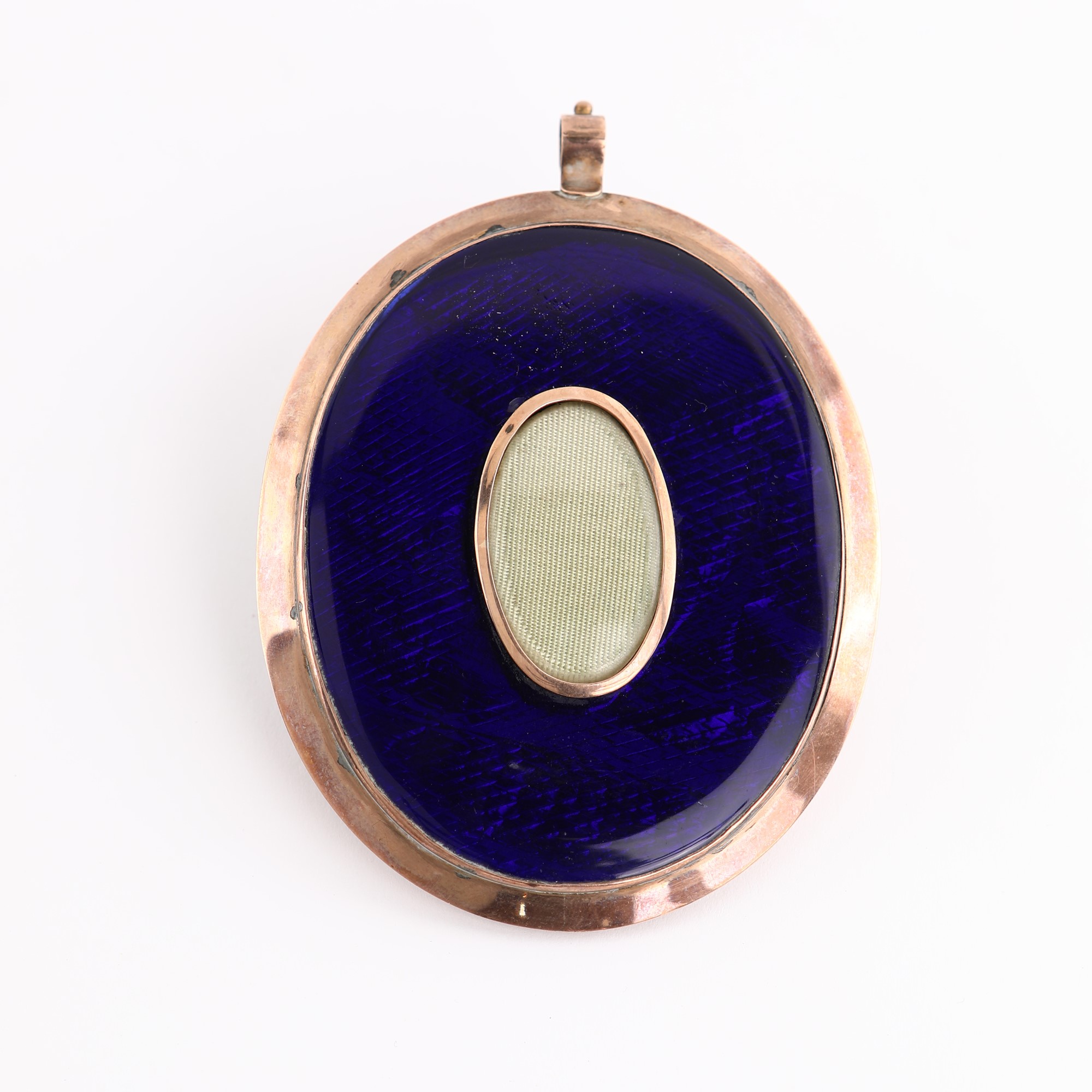 miniatura a sesto ovale racchiusa in un medaglione in vetro con telaio in rame; al verso nicchia centrale porta reliquia racchiusa entro ampia bordura in vetro blu al cui interno è applicato un sottile inserto in lamina di stagno martellata a simulare lo smalto guilloché