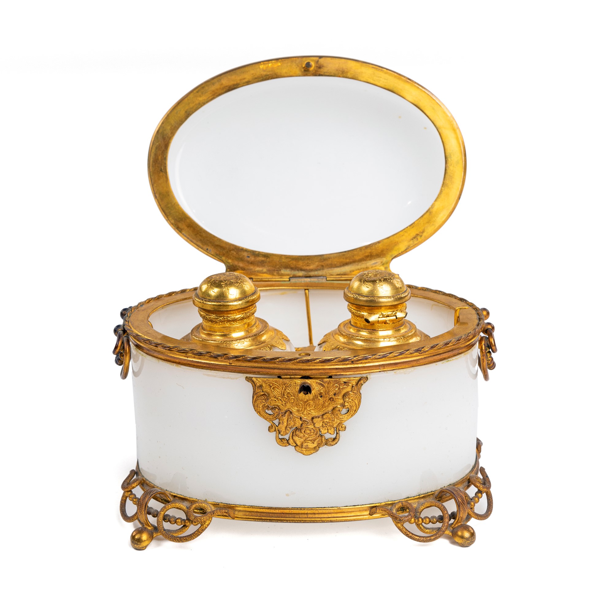 Calamaio in vetro lattimo e metallo dorato, Francia, fine del XIX/inizi del XX secolo cm 11x15x10