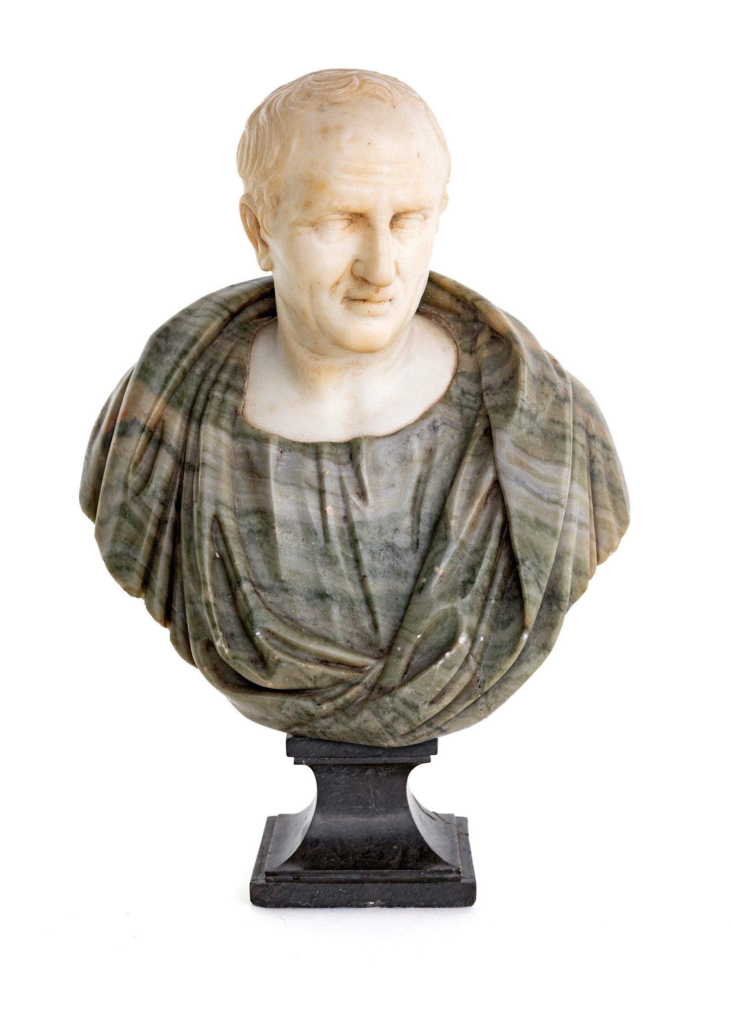 con volto bianco, toga in cipollino e piedistallo squadrato grigio