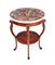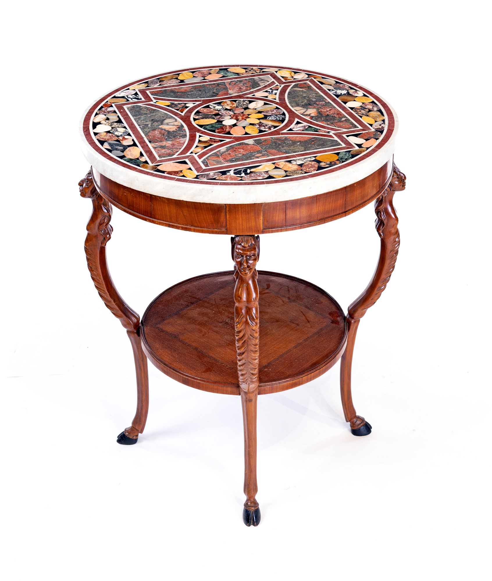 con piano circolare in marmo bianco decorato da inserti multiformi a simulare ciottoli in commesso di marmi e pietre dure disposti entro riserve geometriche delimitate da profili in marmo rosso; tre montanti incurvati riuniti da un piano, con estremità superiore intagliata in forma di satiro, piedi a zoccolo