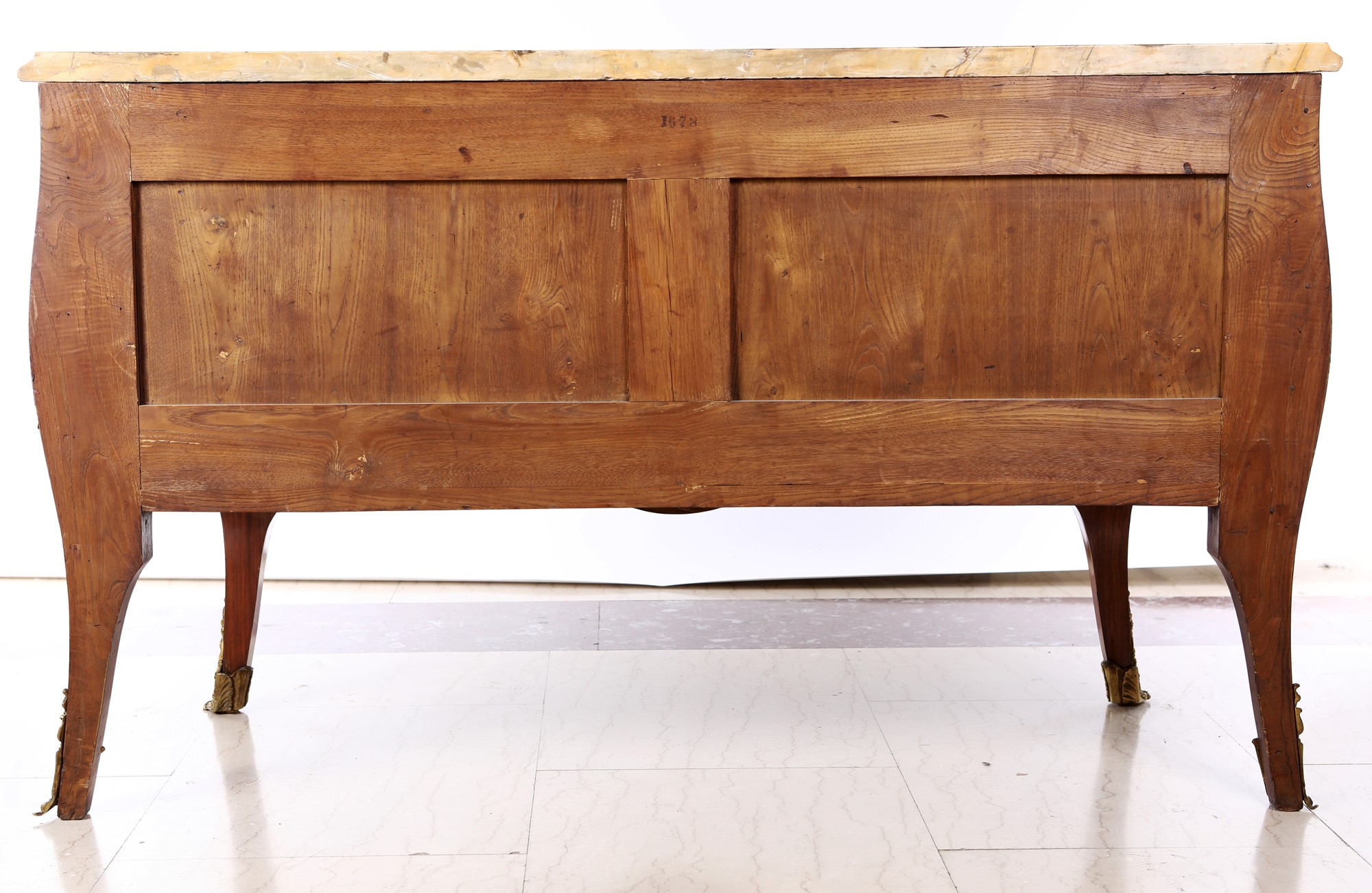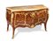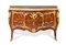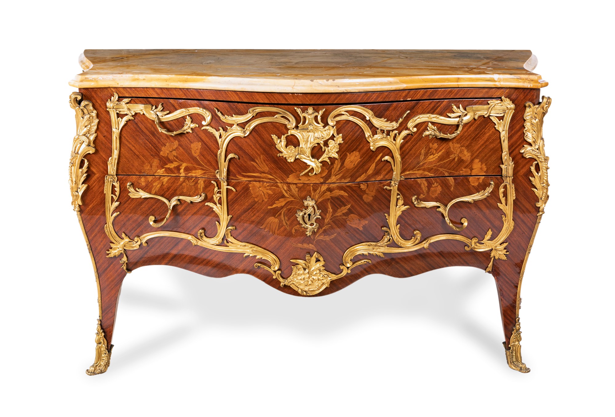 lastronato in legno di rosa disposto a fibre contrapposte con ricca ornamentazione di bronzi dorati posti a cornice delle specchiature decorate da tralci fioriti intarsiati; di forma sagomata con spigoli curvilinei, reca due cassetti frontali ed è rifinito superiormente da piano in marmo giallo; gambe a sciabola calzate da scarpette in bronzo