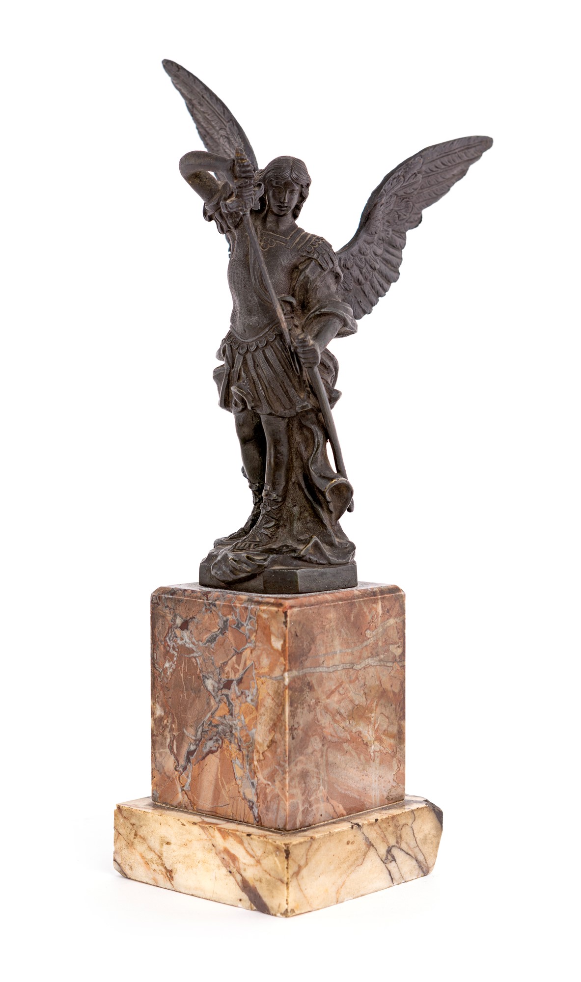 Scultura in bronzo brunito raffigurante San Michele arcangelo, XIX secolo altezza cm 21 - l'insieme cm 32