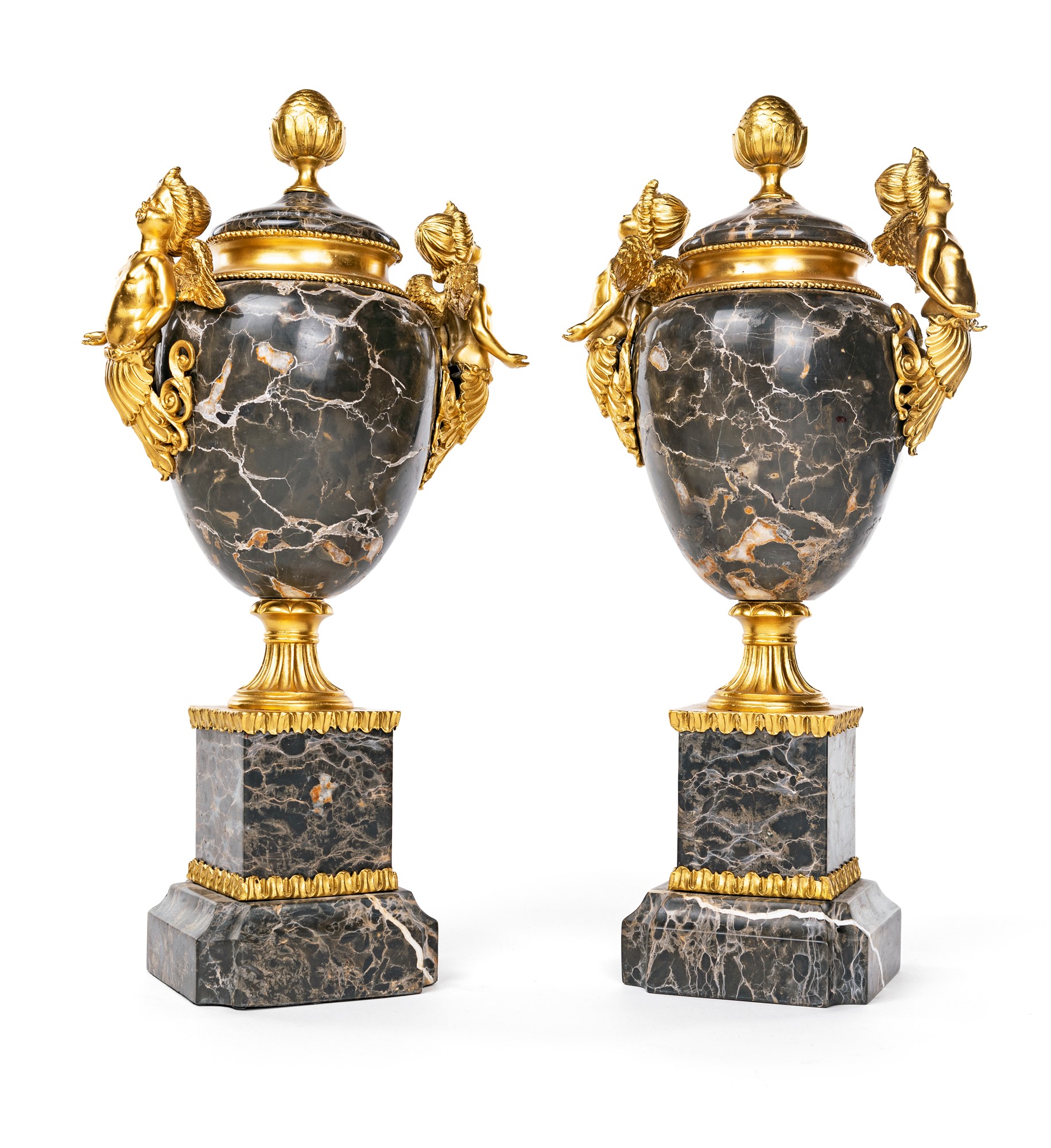 Coppia di vasi con coperchio in marmo e bronzo, XIX secolo cm 52x25 - la base cm 14x14