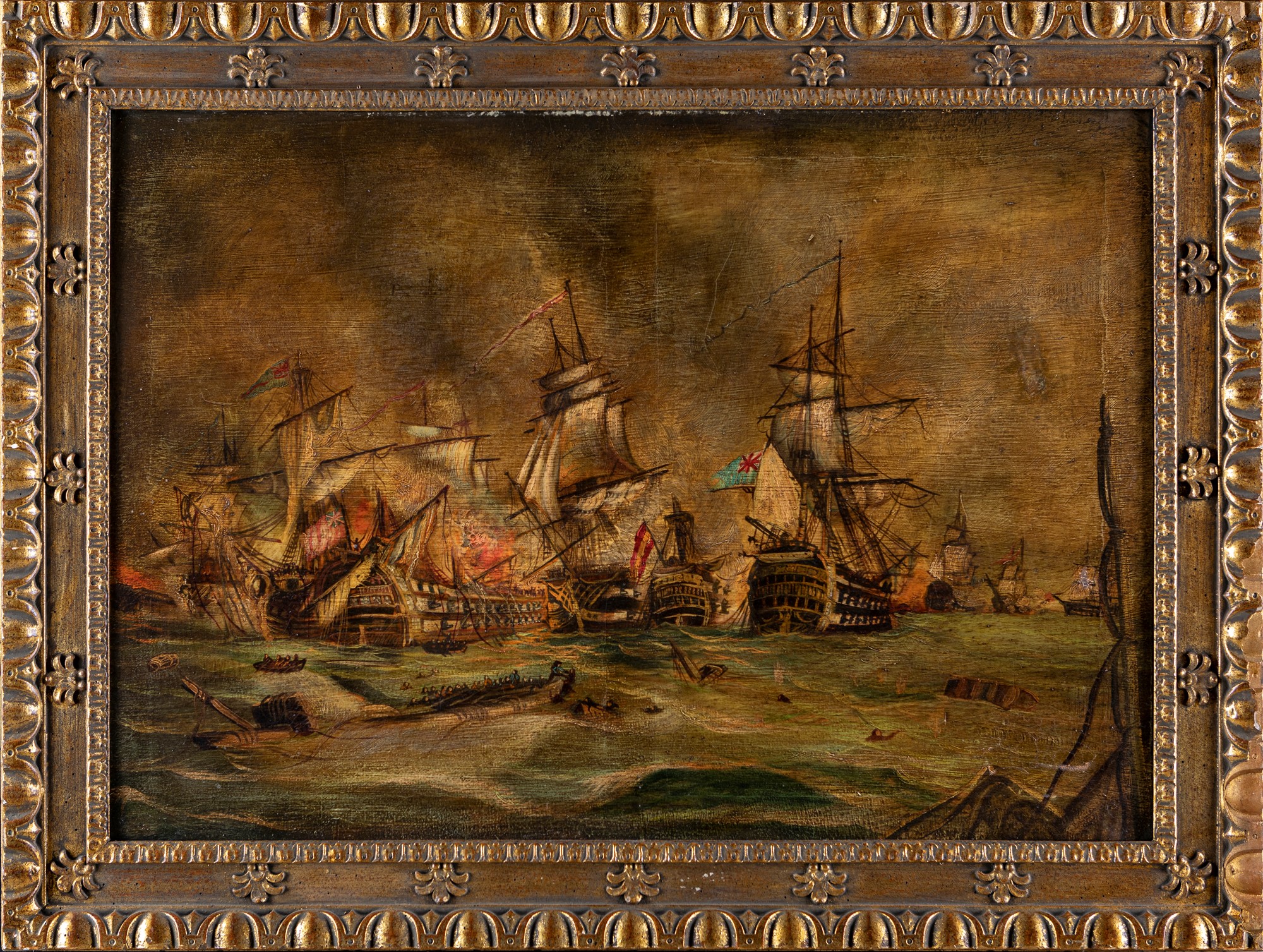 Pittore del XIX secolo ( - ) Battaglia navale fra galeoni inglesi e spagnoli olio su tela cm 71x101