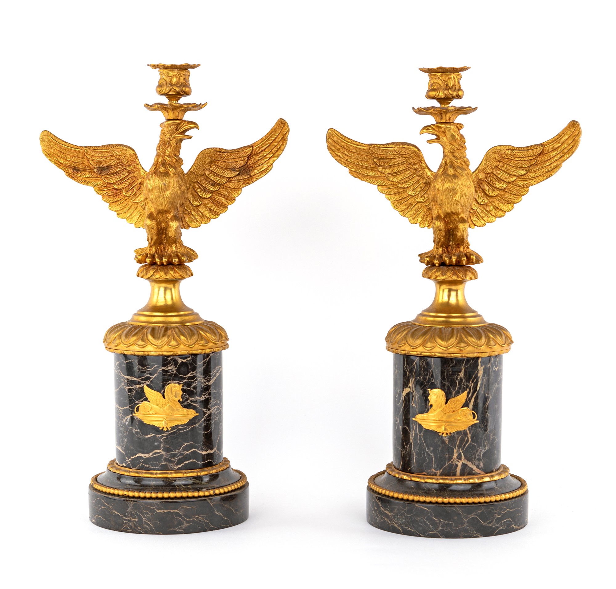 con reggicandela imperniato sulla testa di un rapace al ali spiegate, stante su rocchio di colonna in marmo abbellito da sfinge applicata