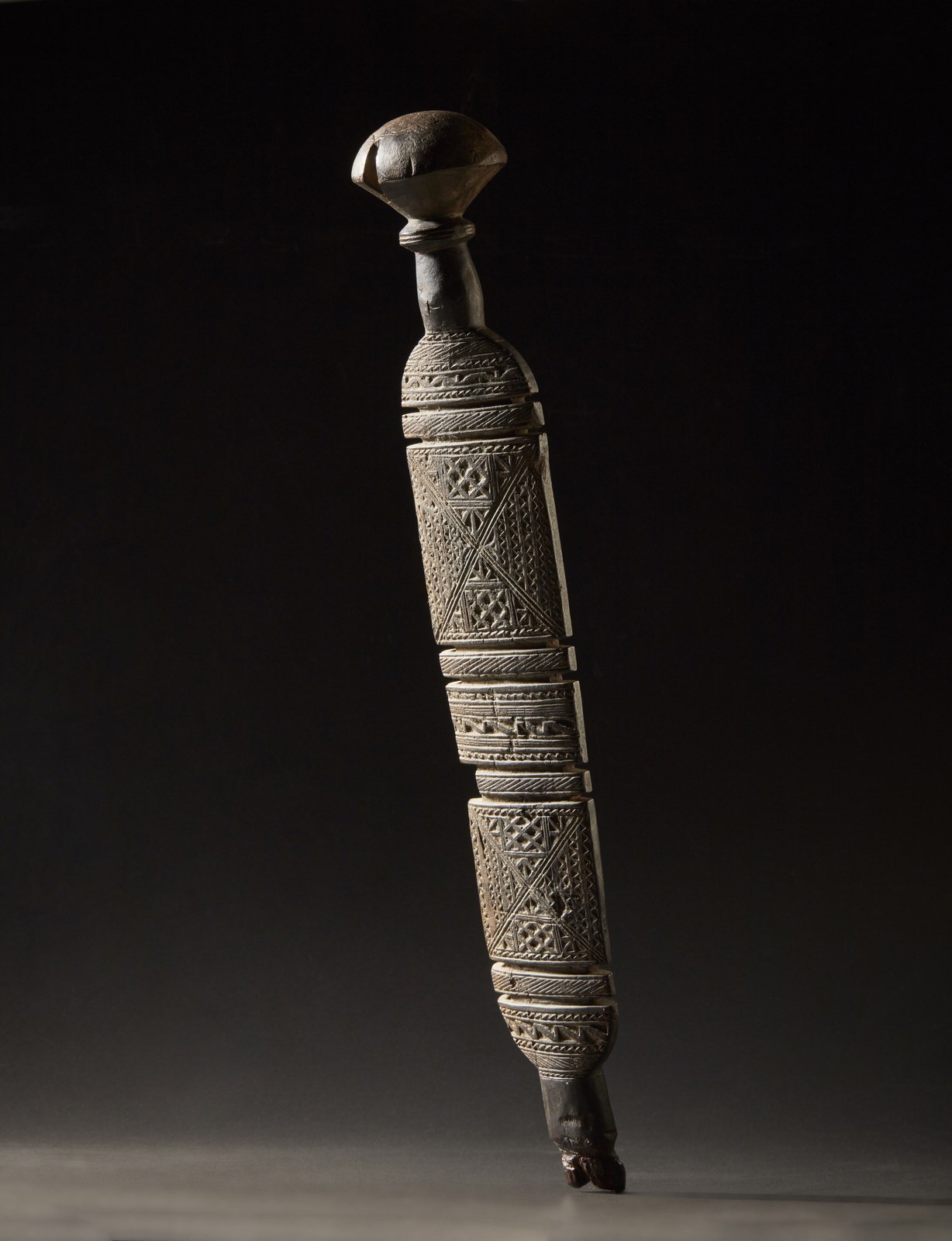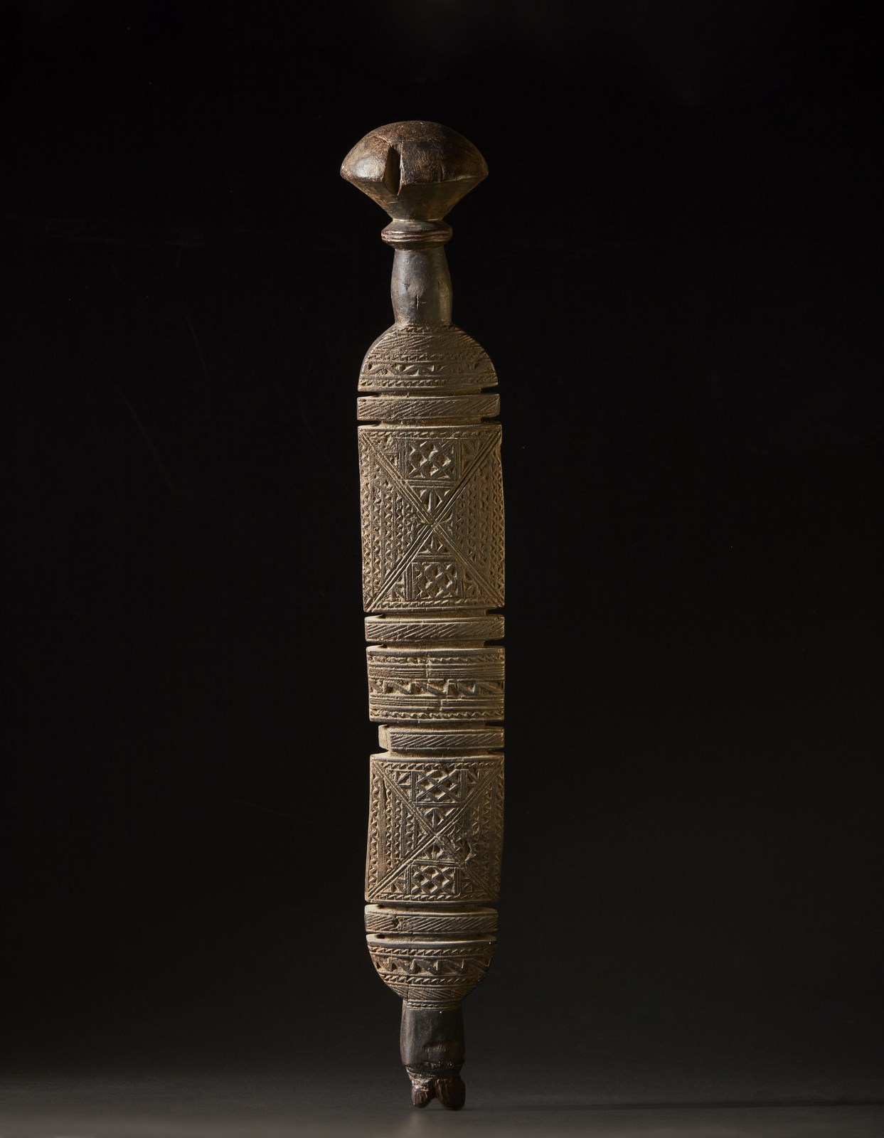 Difetti e segni d'uso. . Cm 9,50 x 65,00 x 8,50. Interamente incisa a motivi geometrici nella parte frontale, questa staffa veniva fissata con corde e cinghie di cuoio al dorso del cammello così da portervi assicurare grossi carichi di borse e fagotti durante le lunghe traversate del Sahara.