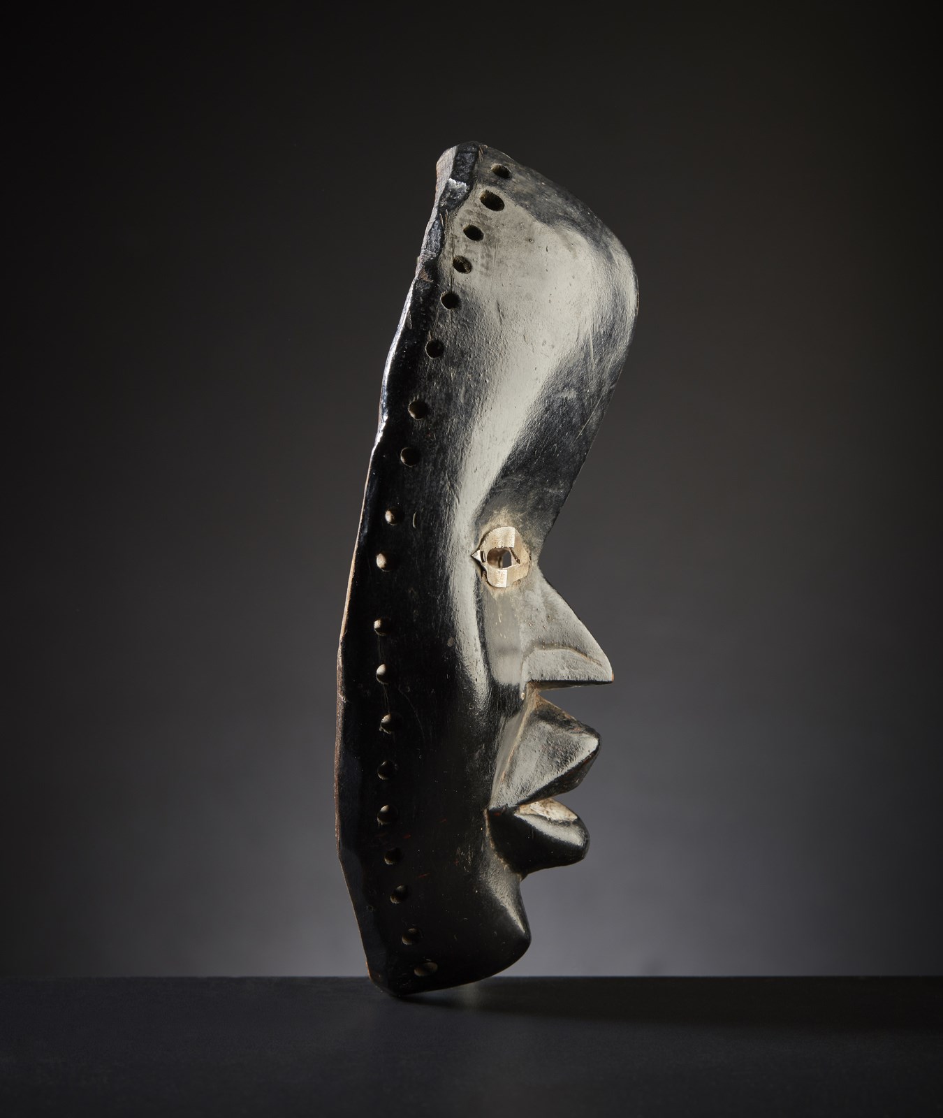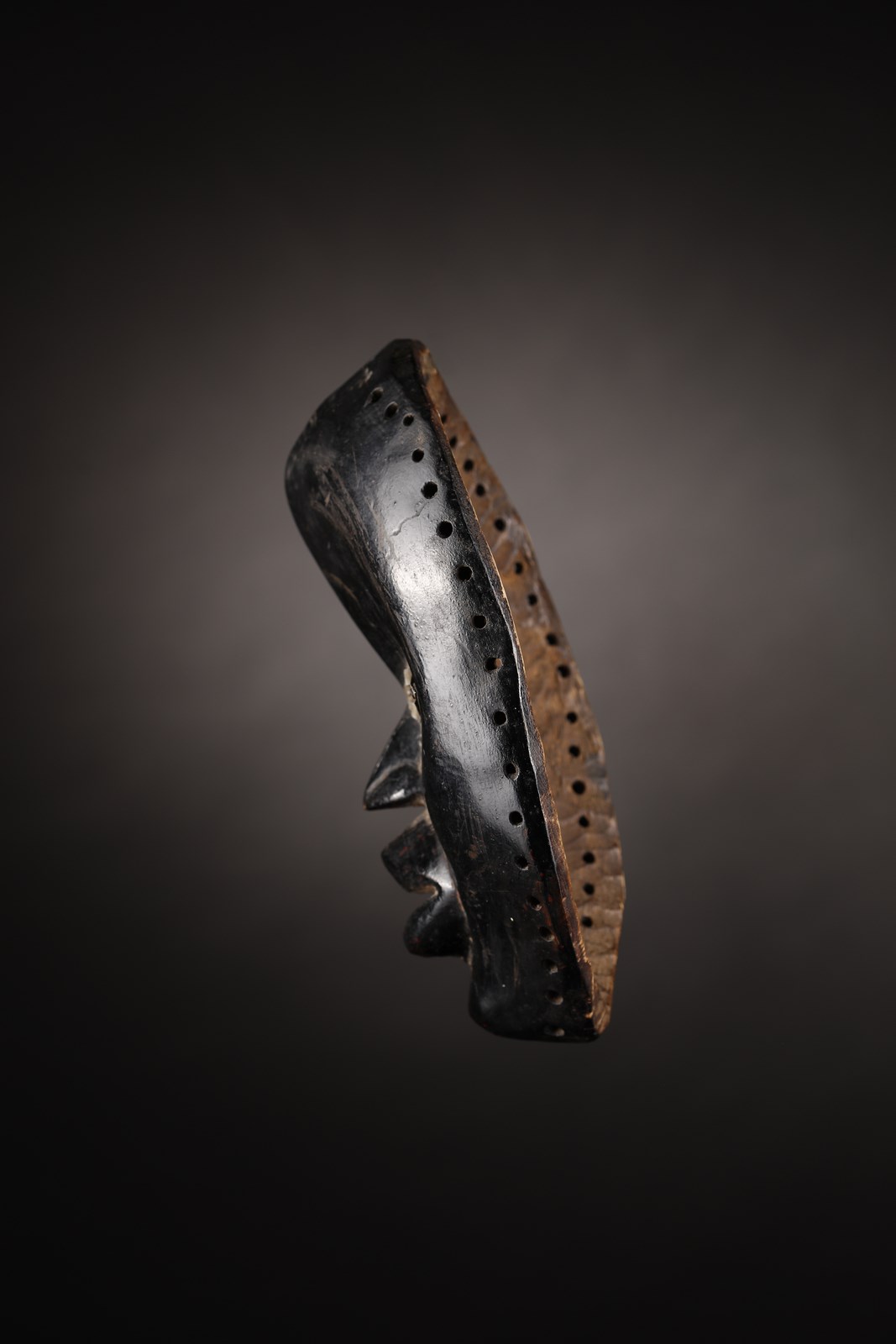 Il metallo utilizzato aiuta a collocare questa maschera in uno spazio temporale non particolarmente antico, ma questa maschera dai volumi pieni ed equilibrati, non risulta esser stata invecchiata artificialmente in nessuna sua parte, La patina della vernice nera con cui è stata più volte dipinta contiene piccole tracce di colore rosso, retaggio di chissà quale storia ed al retro risulta sapientemente scolpita dall uomo e magnificamente lucidata dall'usura e dal tempo.