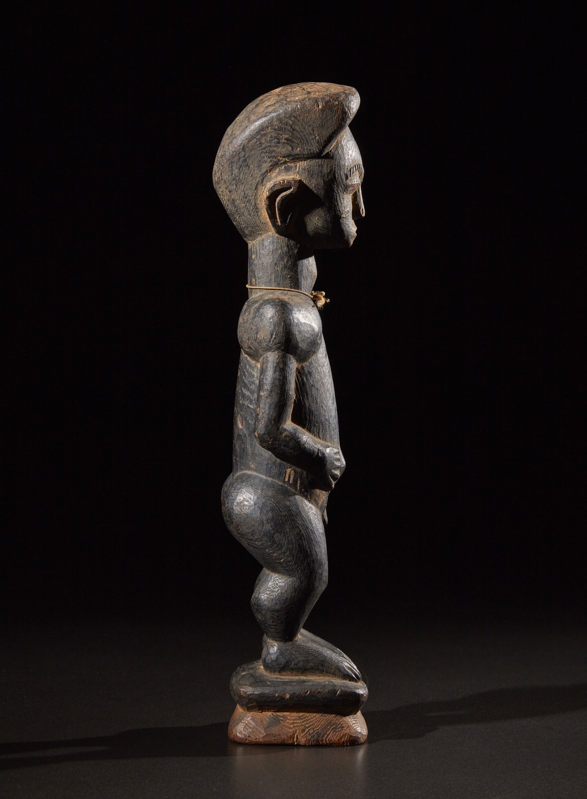 . . Cm 7,50 x 30,00 x 6,50. Scultura antropomorfa Baulè con occhi rossi, probabilmente di epoca coloniale visto lo stile poco elaborato dell'acconciatura e l' inesistenza delle scarificazioni sul corpo, di buona qualità d'intaglio ed equilibrate proporzioni. Bella anche la patina nera che lascia trasparire le usurate venature del legno ed i numerosi segni d'uso.