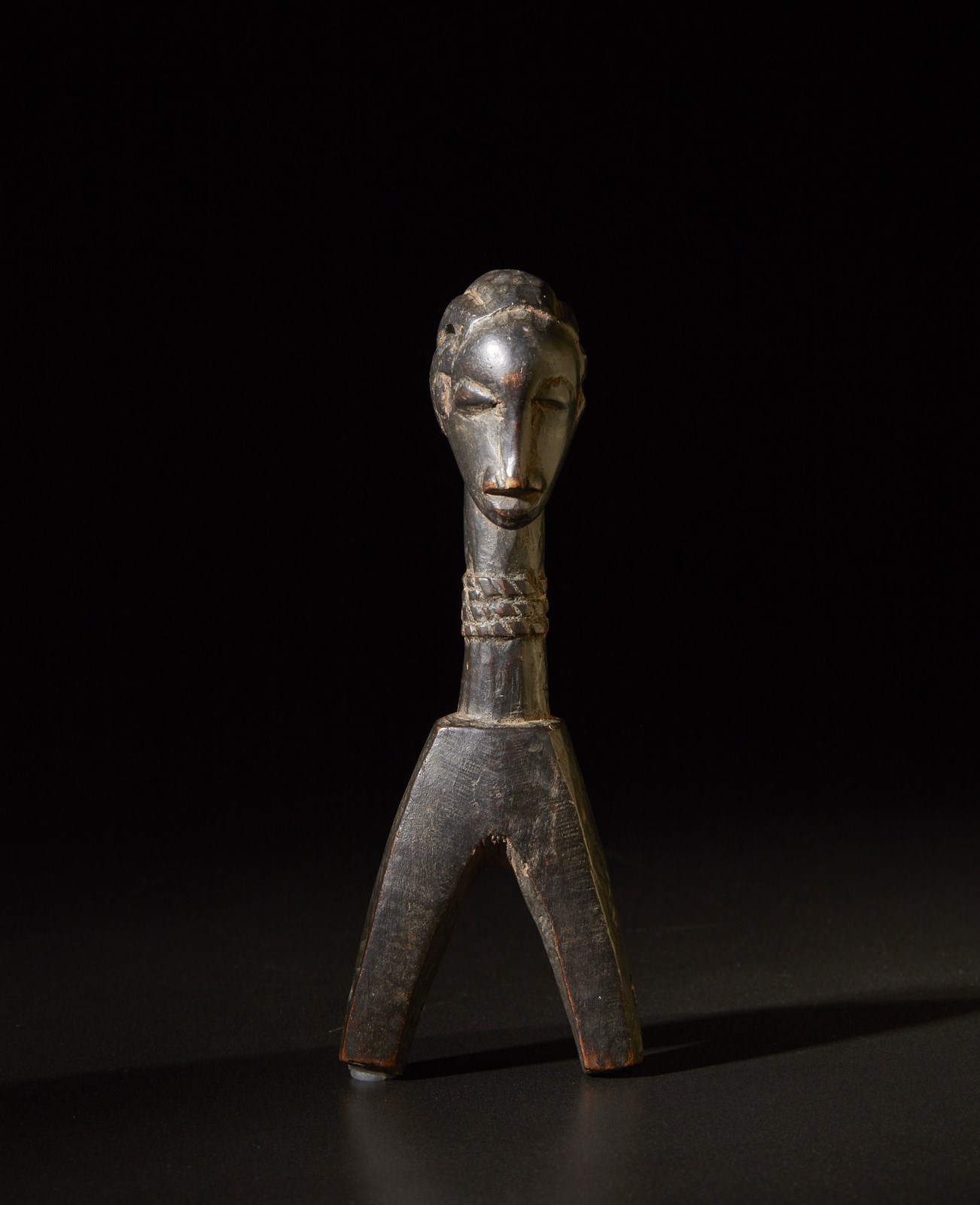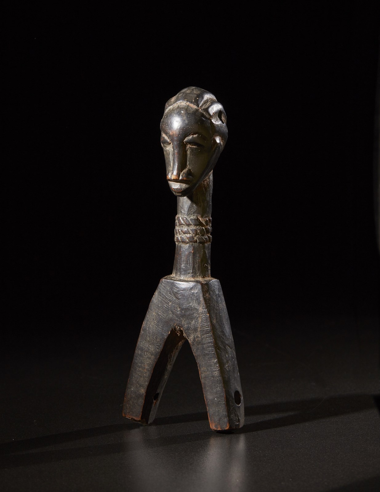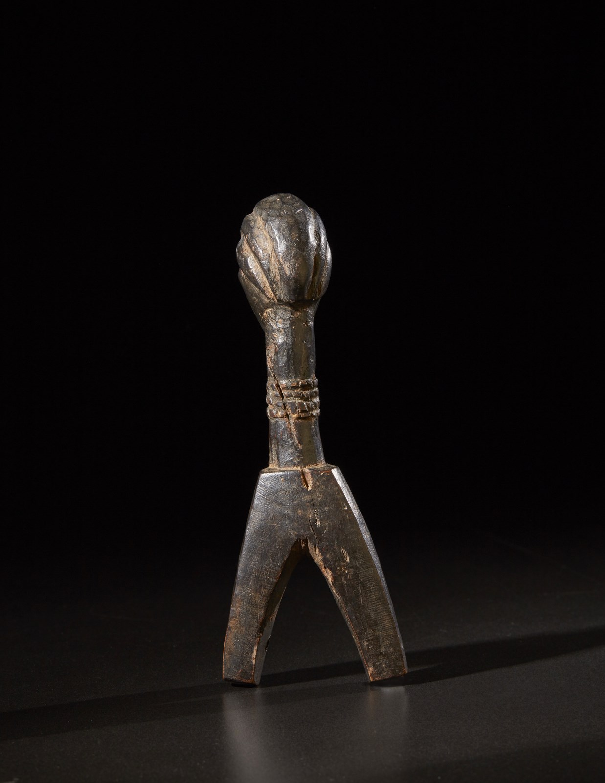 Segni d'uso. . Cm 6,50 x 17,50 x 5,00. Puleggia da telaio per tessuti caratterizzata da una testina antropomorfa con un viso stilizzato e corrucciato.