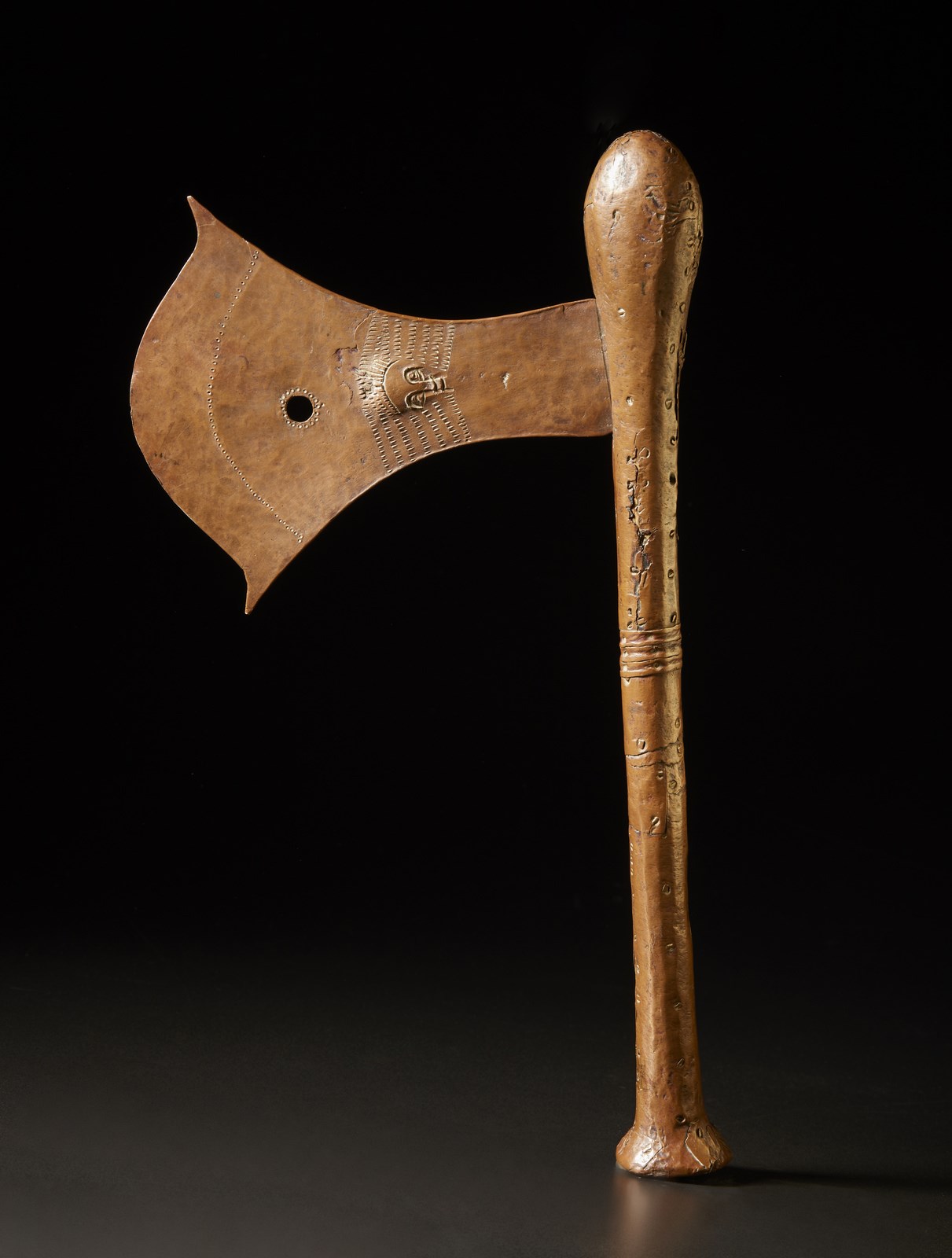Segni d'uso. . Cm 22,00 x 39,00 x 3,50. Circa un'ascia in rame come questa, un autore anonimo scriveva su una rivista del 1896 che non si trattava di uno strumento di guerra o di lavoro, ma di insegne che i capi locali rimettevano nelle mani dei loro emissari e testimoniavano cosi i poteri a volte anche molto estesi, dati allo stesso.