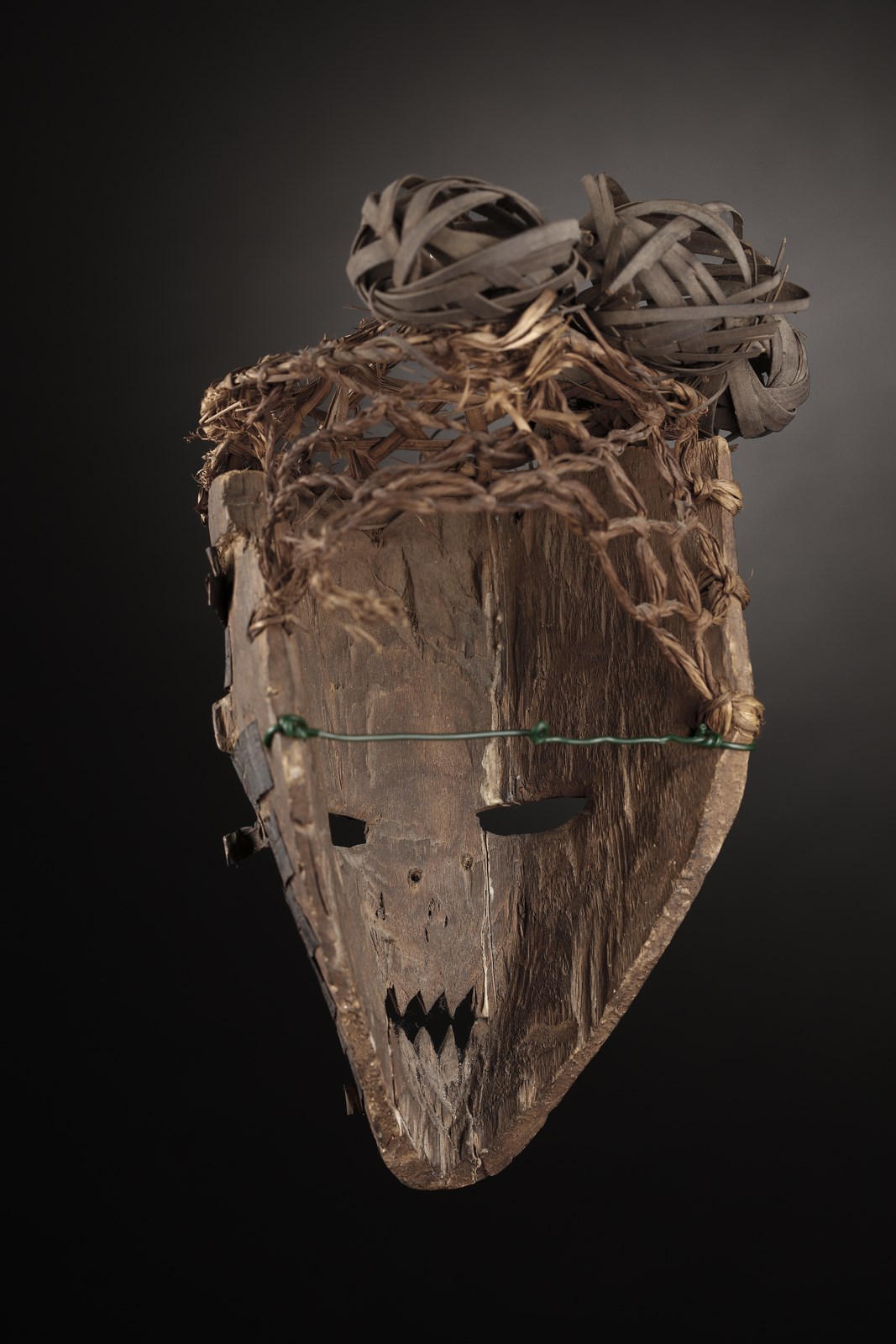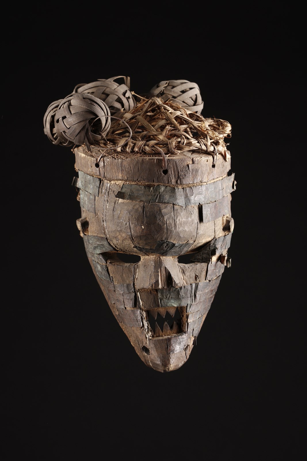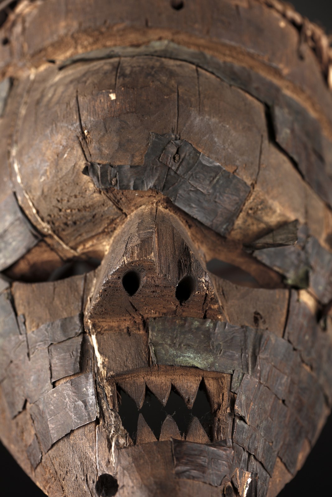 Patina naturale. segni d'uso. . Cm 15,00 x 29,00 x 16,00. Questa maschera caratterizzata da fronte prominente, denti aguzzi, lastronata con sottili fogli di rame ed adornata da palle in fibra vegetale intrecciata sul capo, rientra tra le maschere Salampasu Wamulandwa utilizzate durante i riti iniziatici e per le danze della società segreta maschile Mfuku.