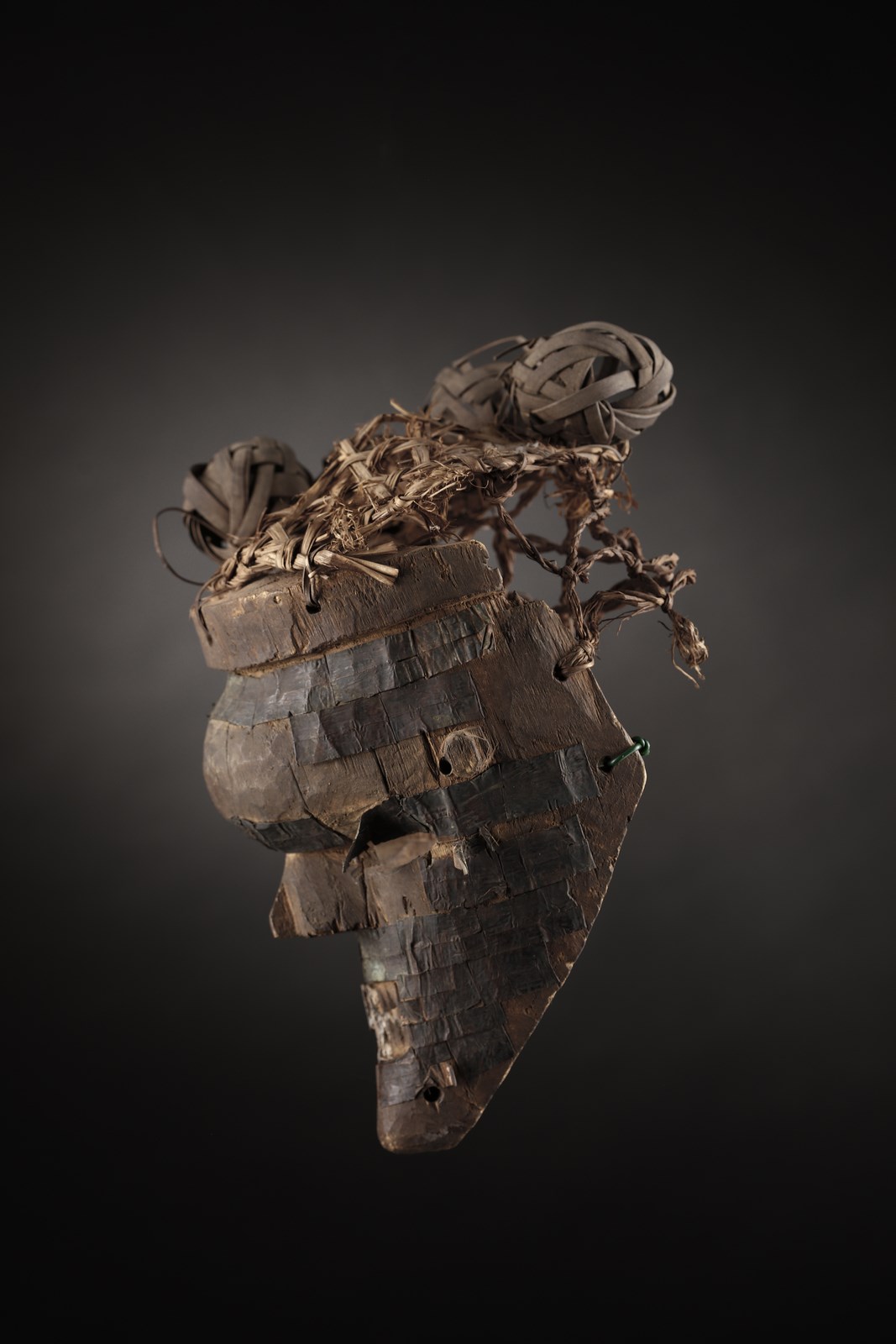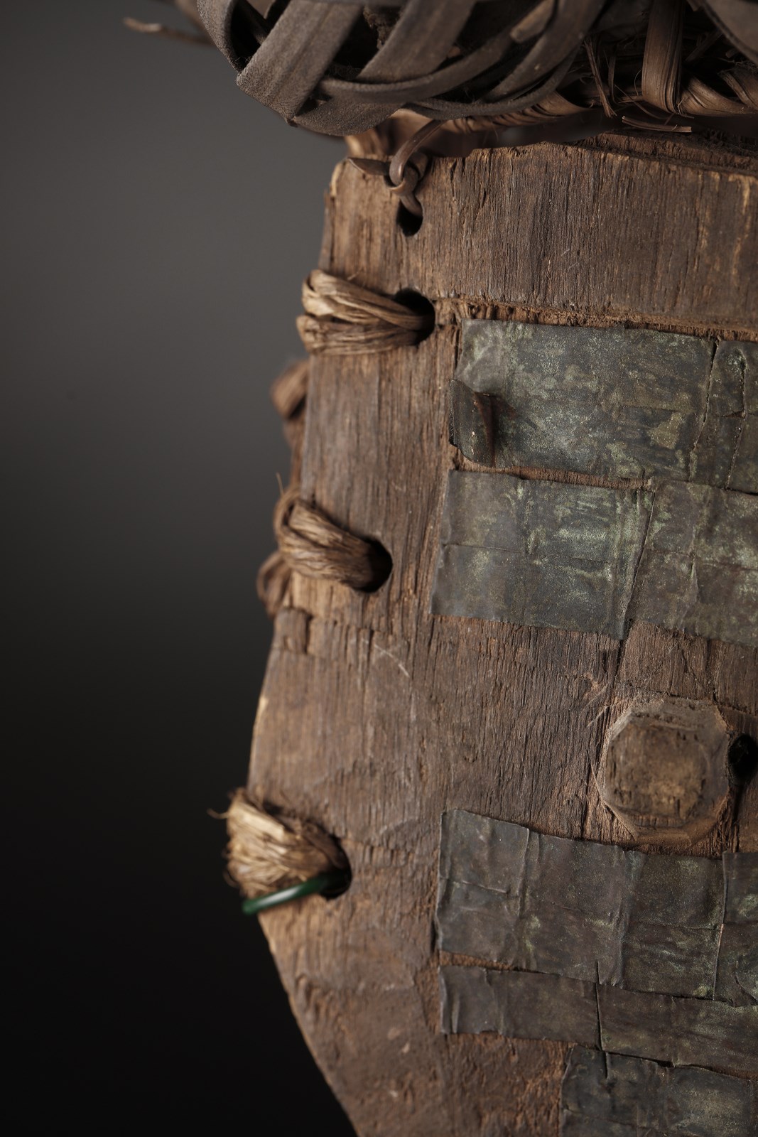 Salampasu - Repubblica Democratica del Congo - Maschera Wamulandwa. Legno duro, fibre e lamelle di rame. Patina naturale. segni d'uso.