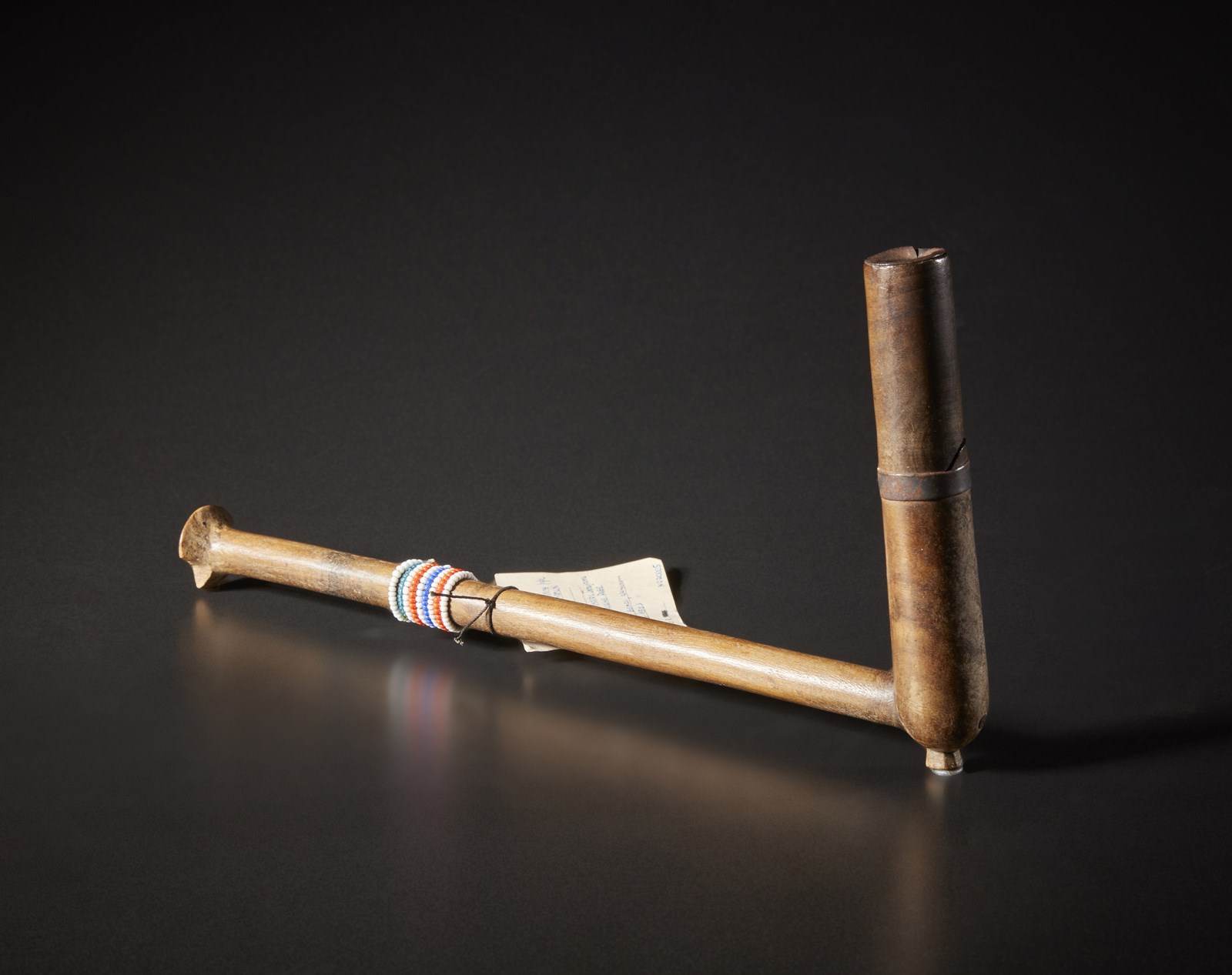 Xhosa - Sudafrica - Pipa da donna. Legno duro a patina naturale, metallo e perline. Una rottura con restauro, segni d'uso ed un'etichetta di vendita. .