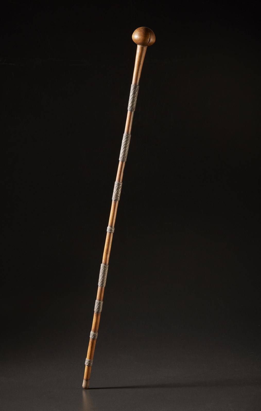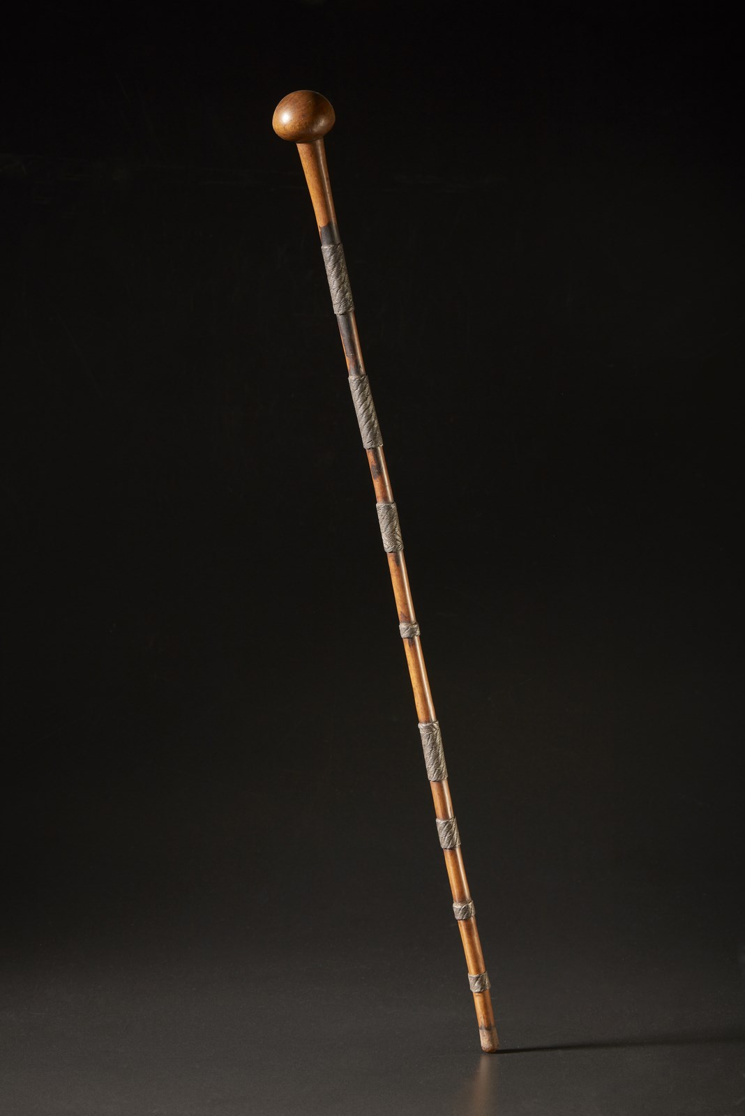 Difetti e segni d'uso. . Cm 5,00 x 76,50 x 5,00. Bella ed antica mazza da guerra ed insegna di rango Zulu, caratterizzata da un piccolo pomello contundente in legno duro e da otto ordini di decorazioni in fil di ferro intrecciato nella tipica lavorazione Zulu.