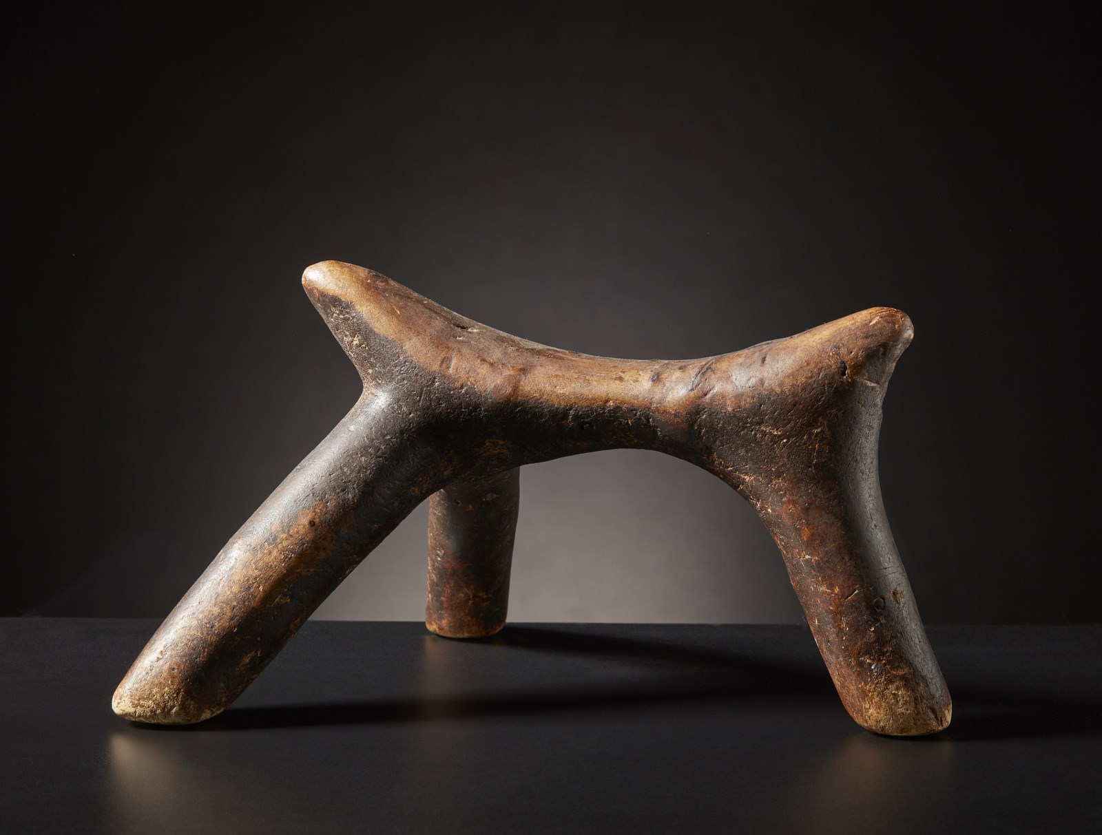 Segni d'uso. . Cm 21,00 x 28,00 x 15,00. Poggiatesta a forma di ramo levigato con patina grassa, derivante dal prolungato contatto con unguento per capelli.